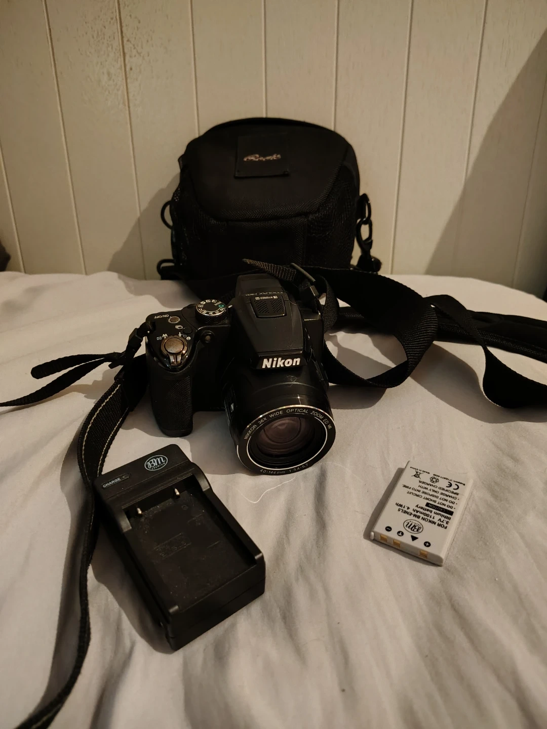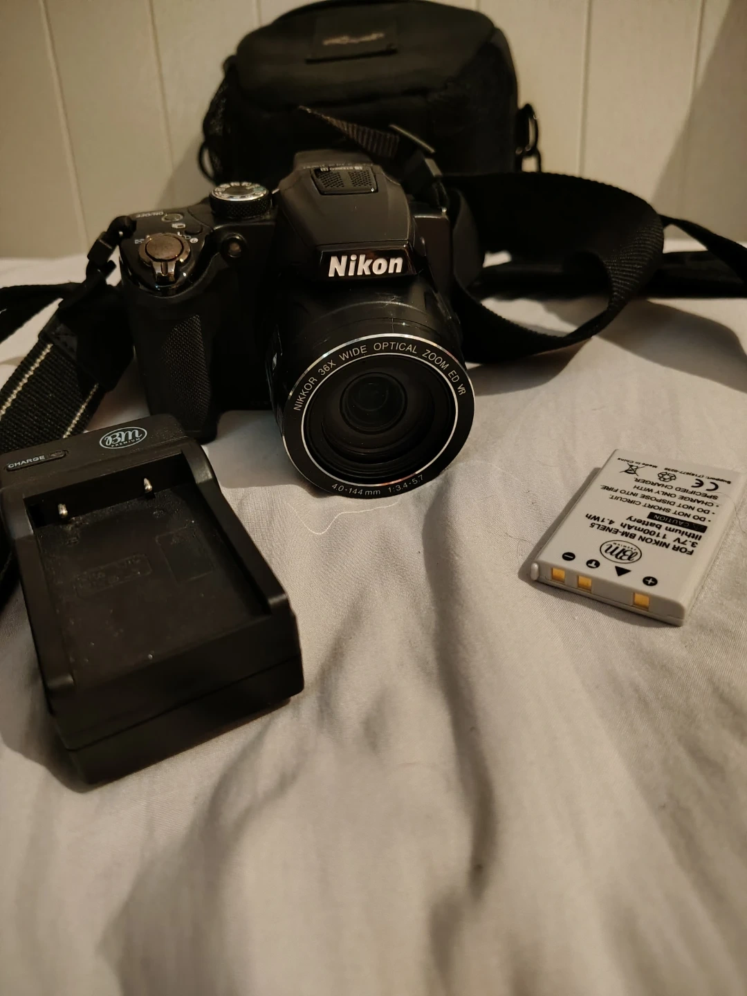 This is a Nikon COOLPIX digital camera. It's black and comes with a carrying case, a battery, and a charger. It features a 36x optical zoom lens.