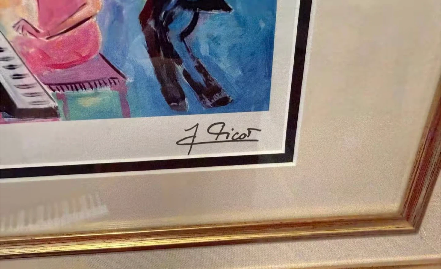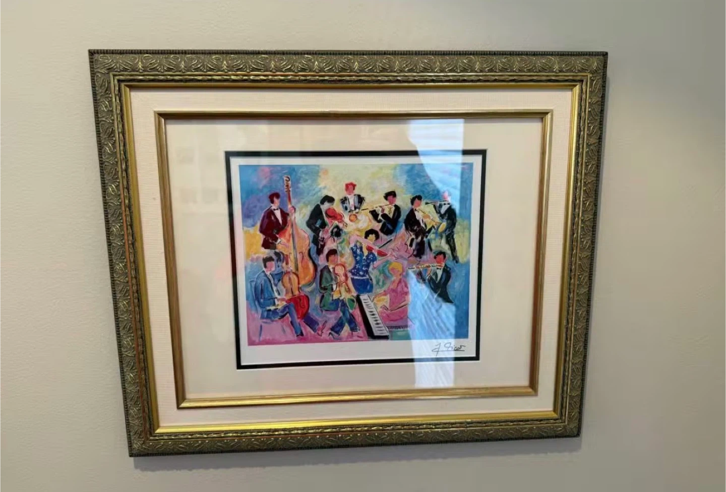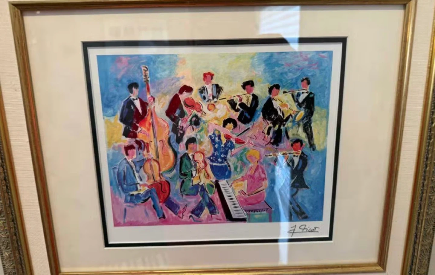 This framed art print features a vibrant depiction of a jazz band, signed by J. Grier. The artwork is matted and framed in a decorative gold-tone frame. It's a colourful piece that would add a musical touch to any room.
