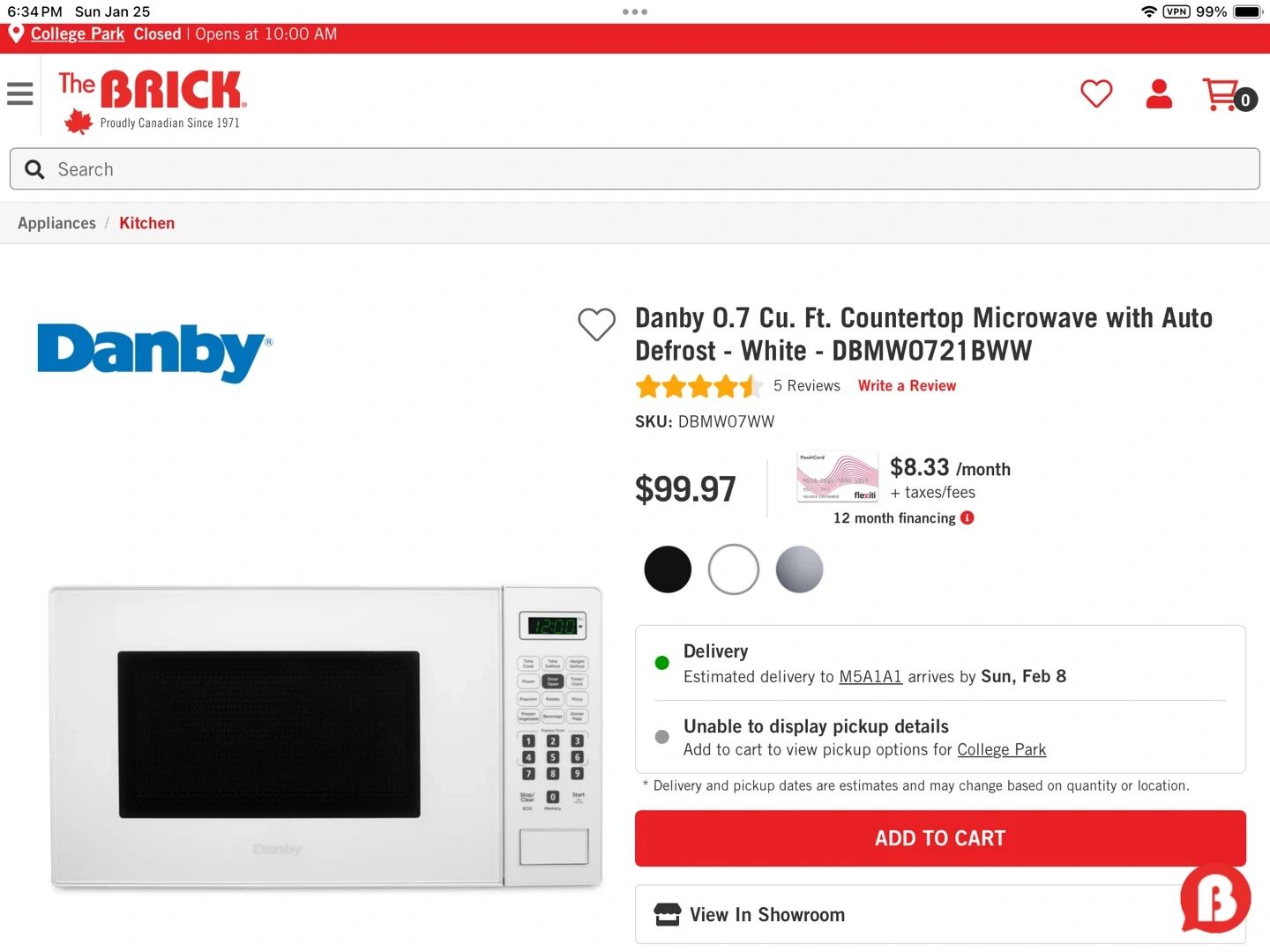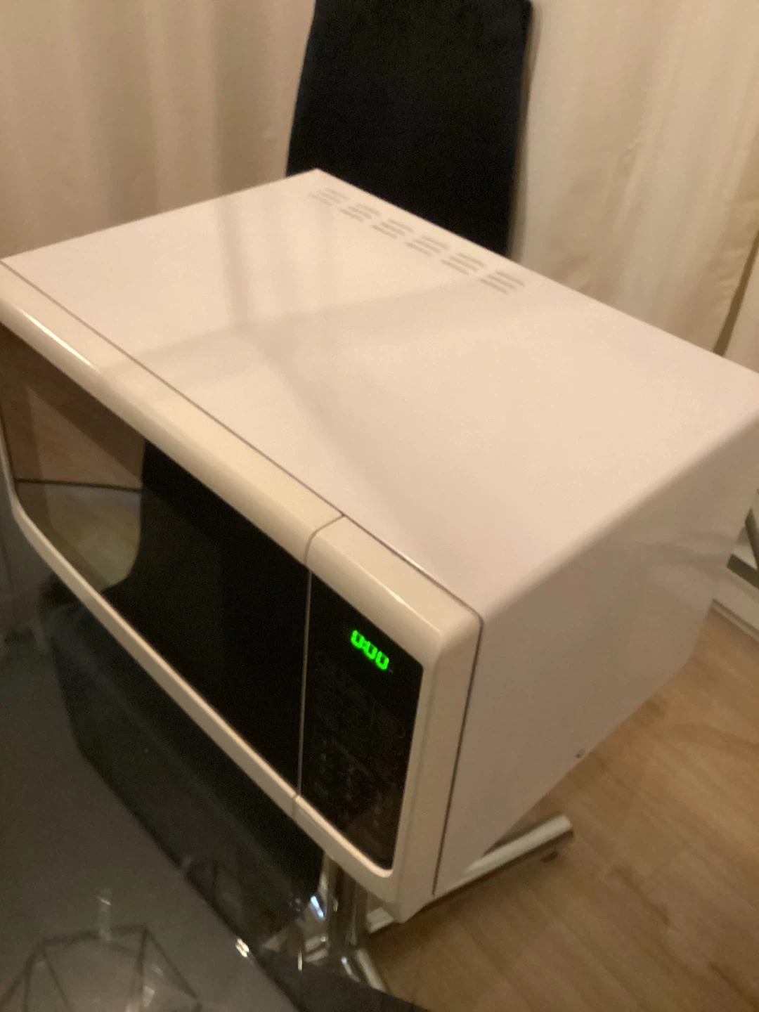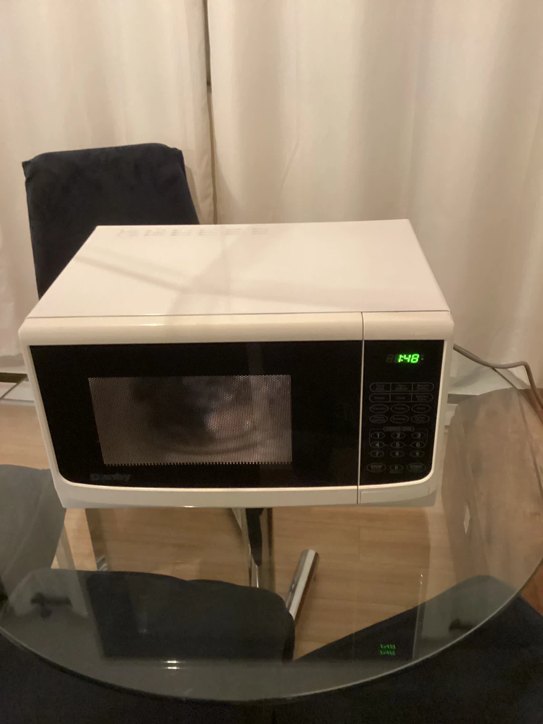 White Danby microwave oven. It includes a rotating glass turntable inside. The digital display shows the time or cooking settings. Great for quick meals and reheating. Clean and ready to go! In good used condition. Just changed colour of appliances.
