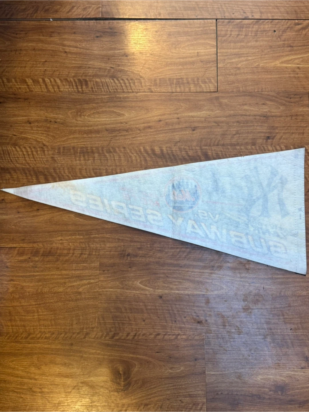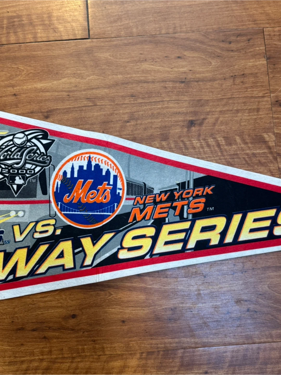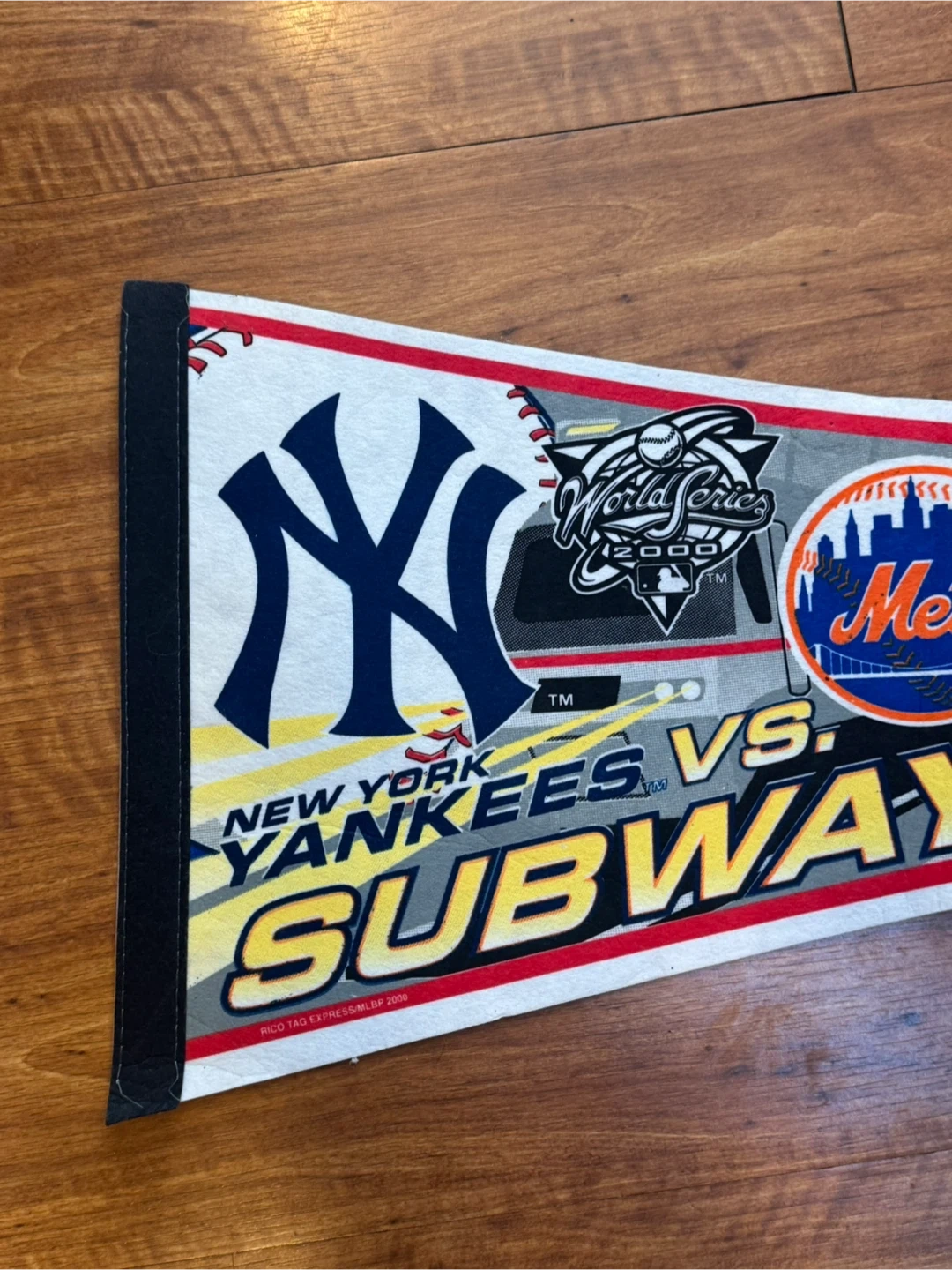 This pennant commemorates the 2000 World Series Subway Series between the New York Yankees and the New York Mets. It features logos for both teams and the official World Series 2000 mark. Felt material with printed graphics.