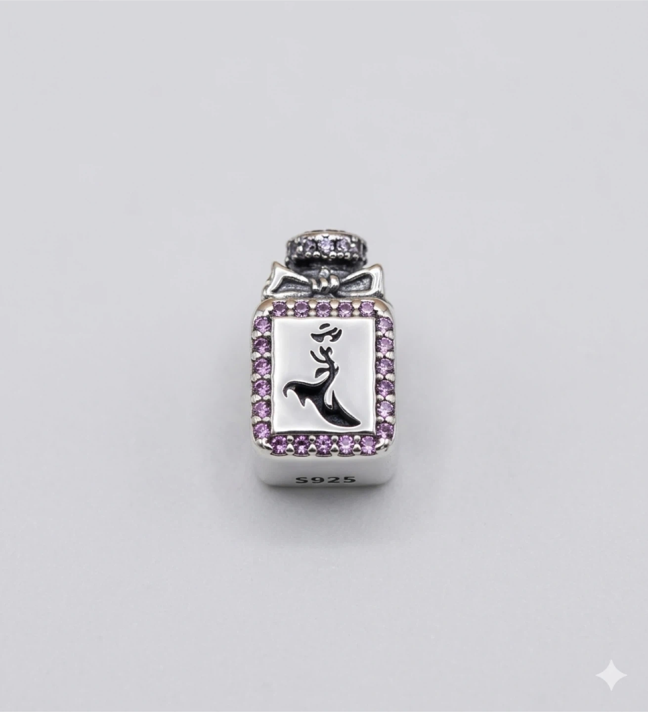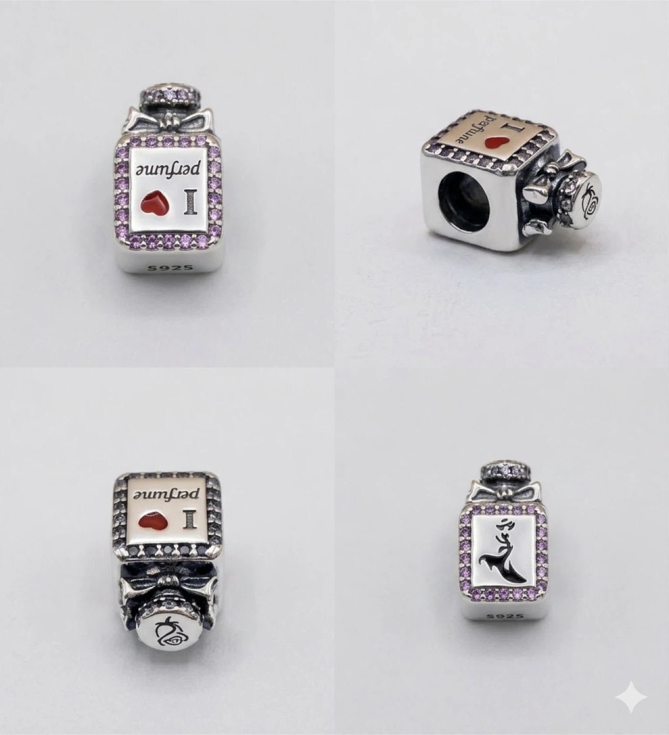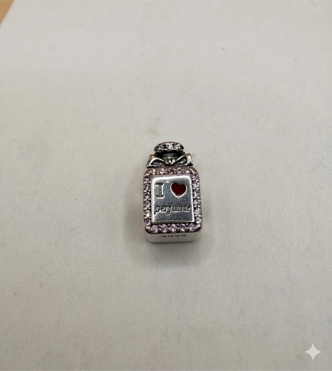 😍Sterling silver charm shaped like a perfume bottle. It features "I love perfume" text with pink accents and a red heart detail. S925 hallmark visible.