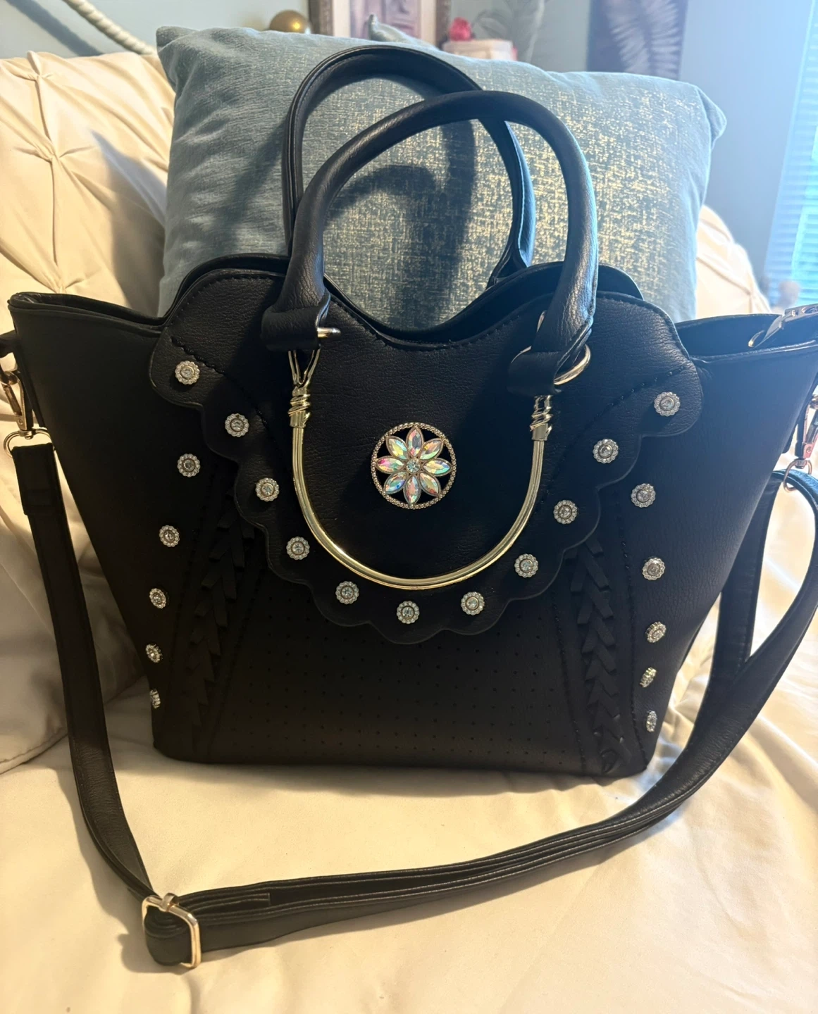 This black handbag features decorative rhinestones and a metallic flower embellishment. It includes top handles and a detachable shoulder strap.