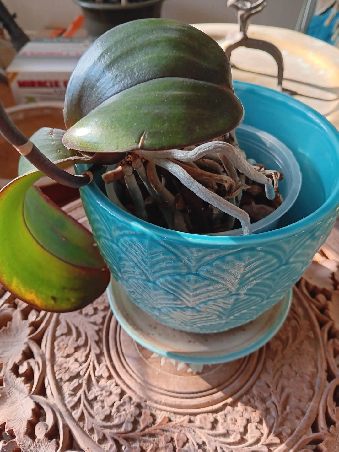Healthy pink/orange phalaenopsis orchid plant with visible roots in a decorative blue pot. It's a beautiful addition to any home!