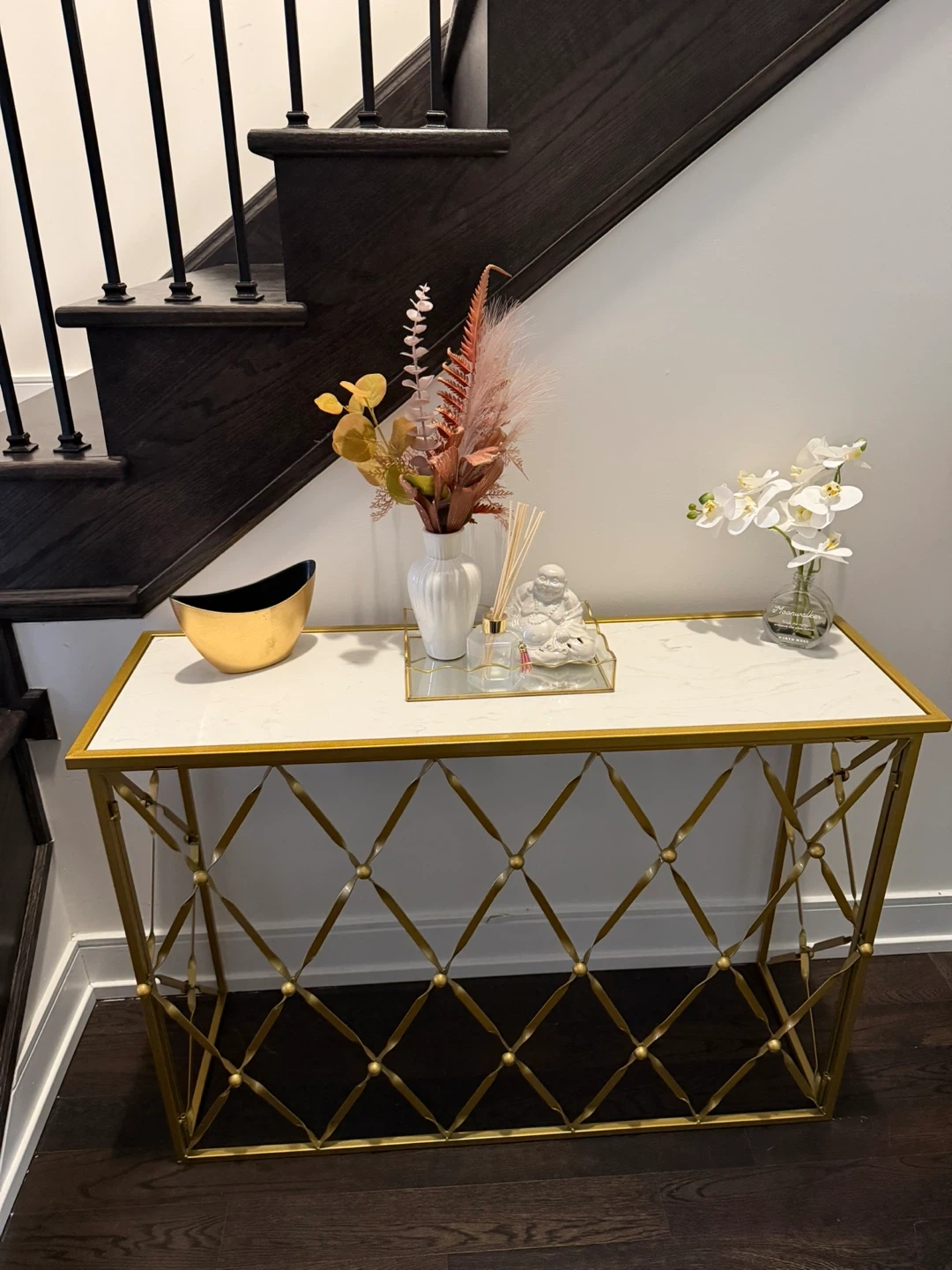 This console table features a gold metal frame with a decorative criss-cross pattern. It has a white faux marble top and would make a stylish accent piece.
