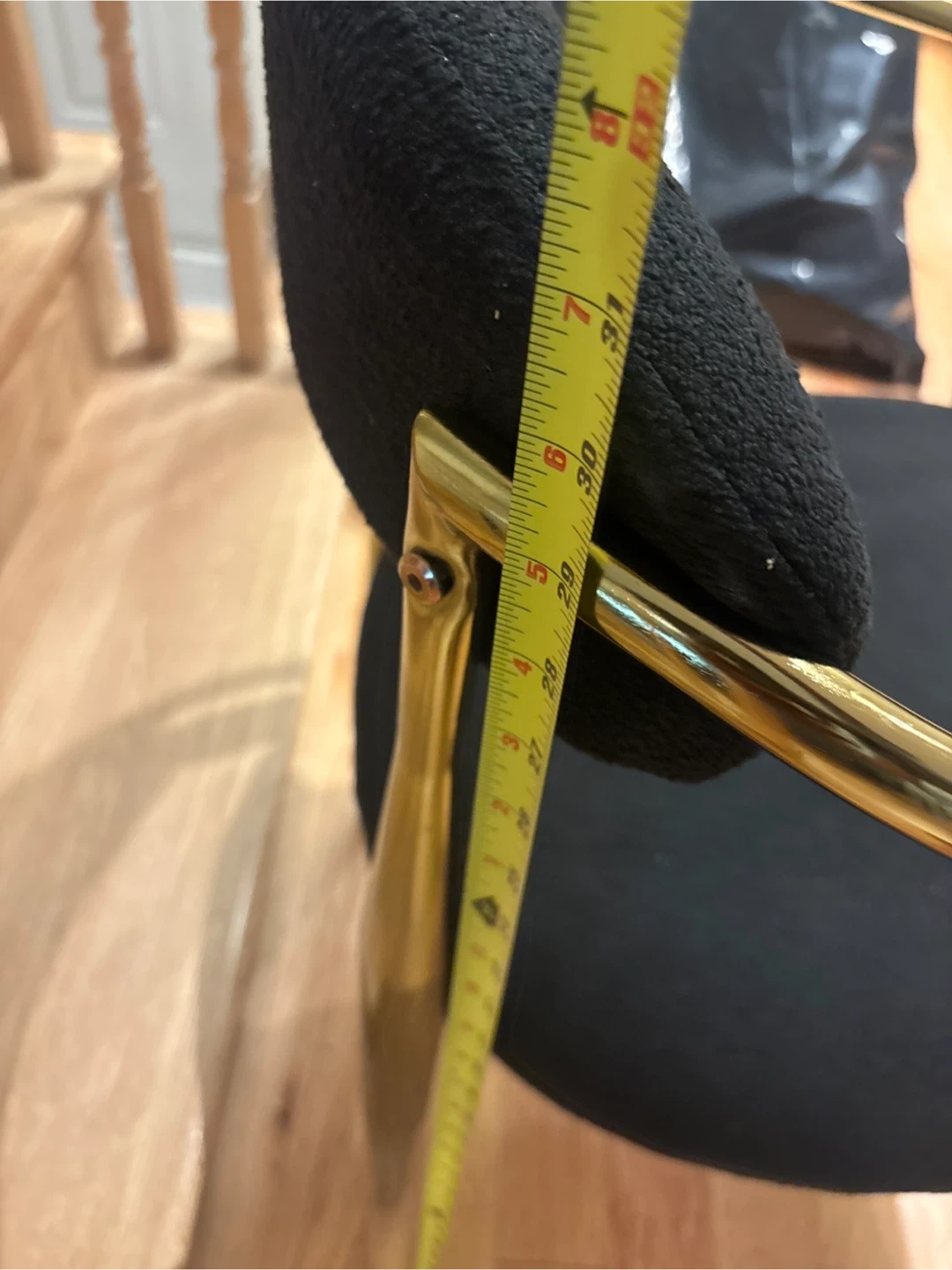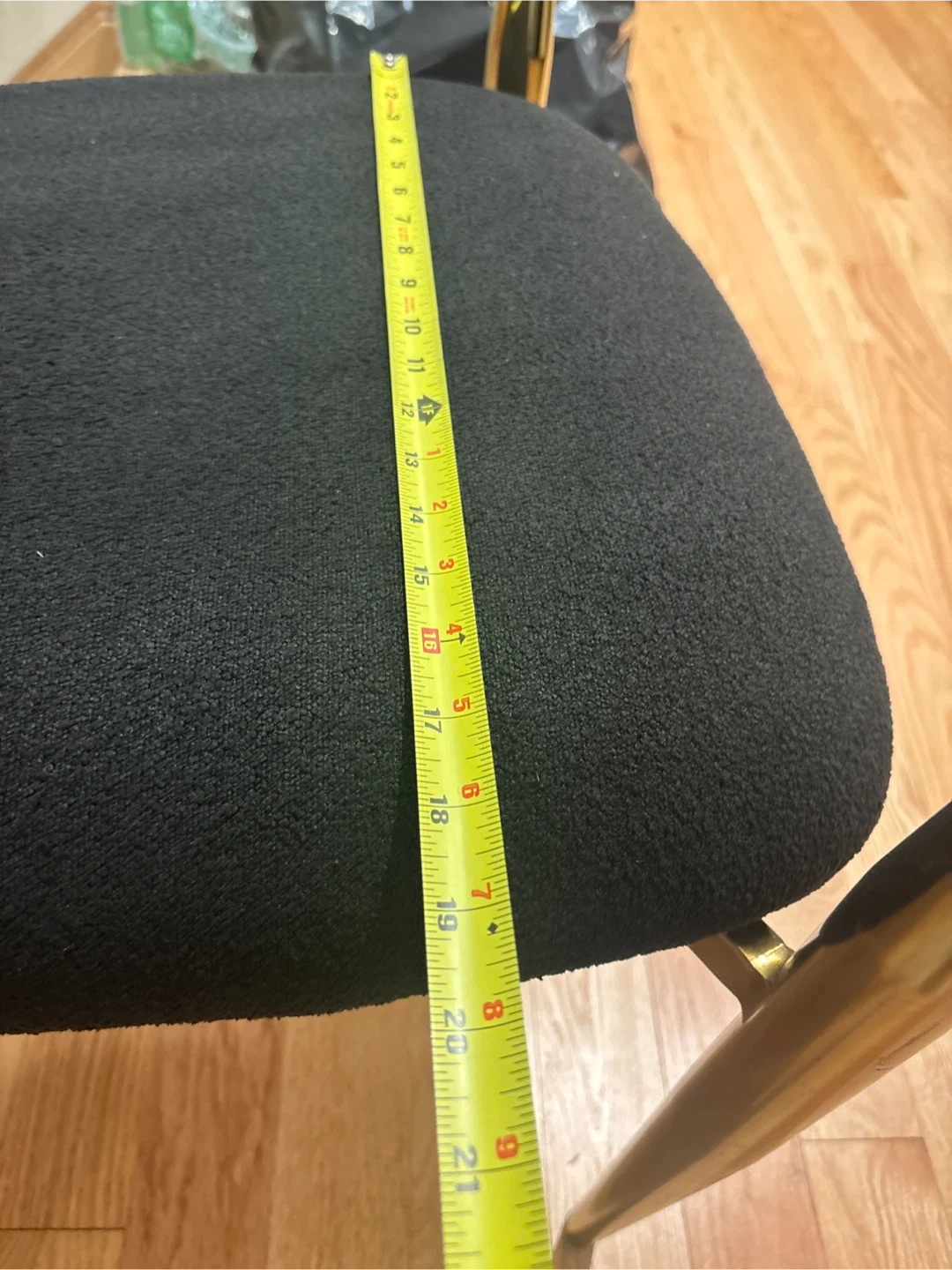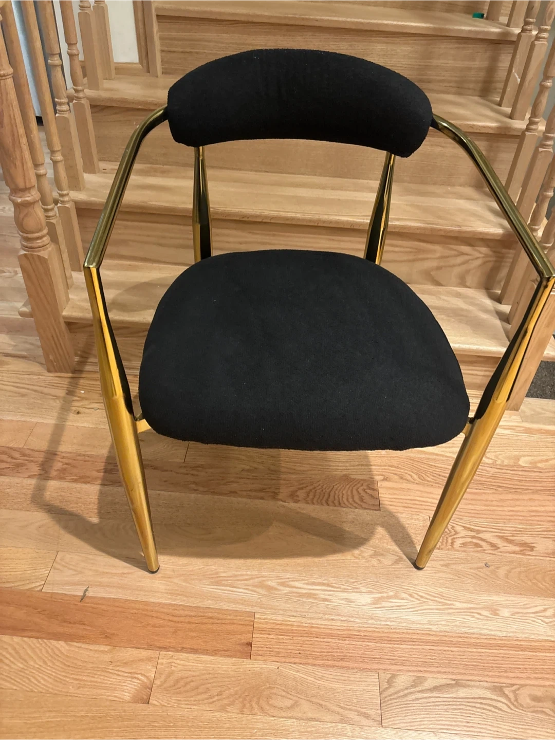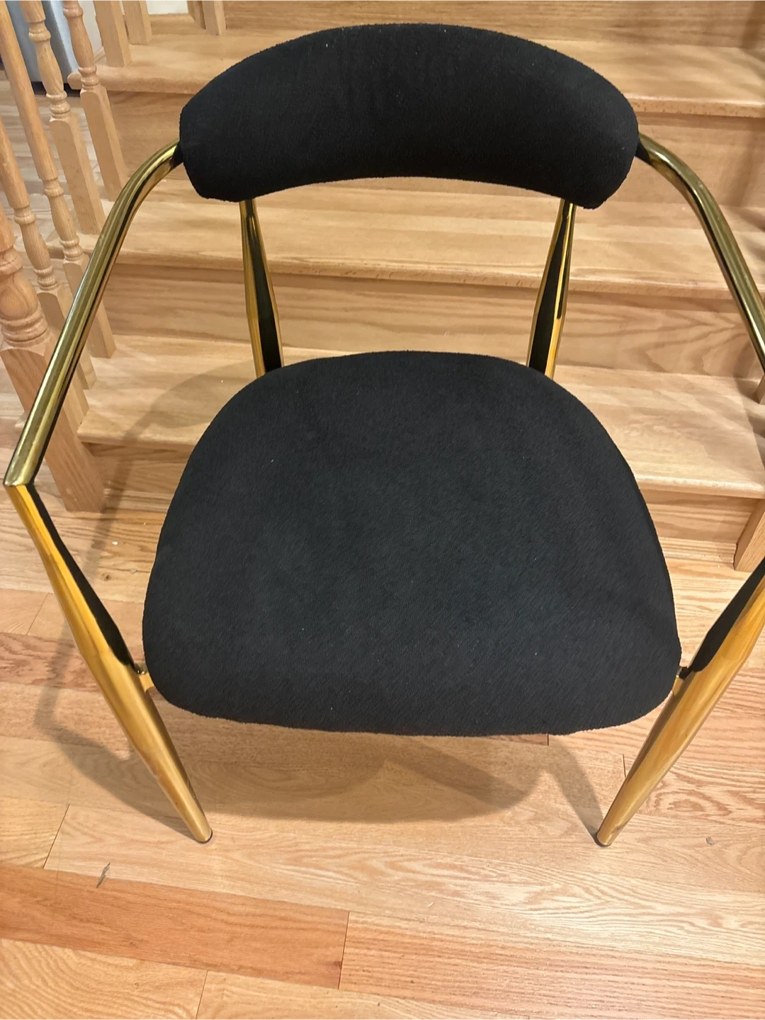 This accent dining chair features a comfortable black fabric seat and backrest. It's supported by a stylish gold-tone metal frame with unique angled legs. This chair would be a chic addition to a living room or entryway.Just 1 available