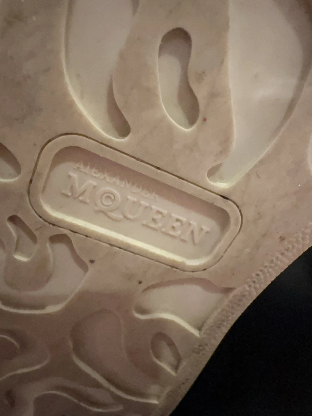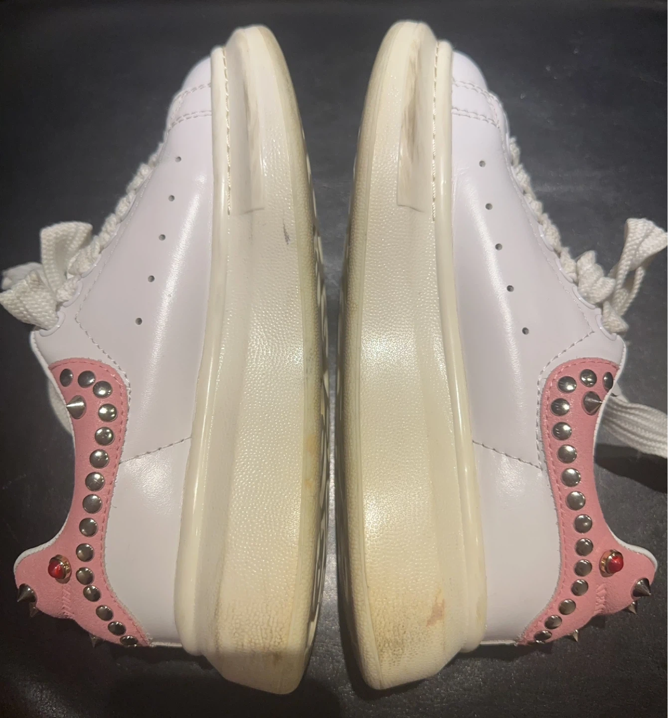 Alexander McQueen sneakers featuring a white leather upper and pink suede detailing with silver studs and red gem accents. Made in Italy. Platform sole.