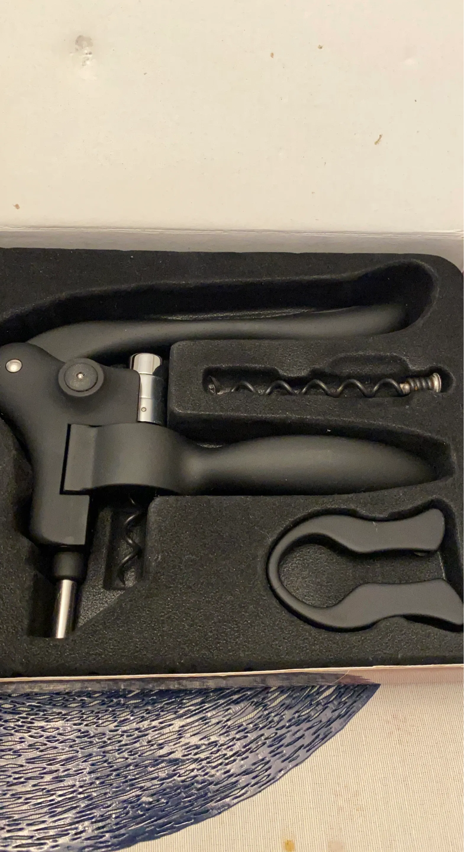This is a black corkscrew wine opener set. It's designed for easy bottle opening. Includes a foil cutter and an extra worm screw. Great for any wine enthusiast's kitchen!