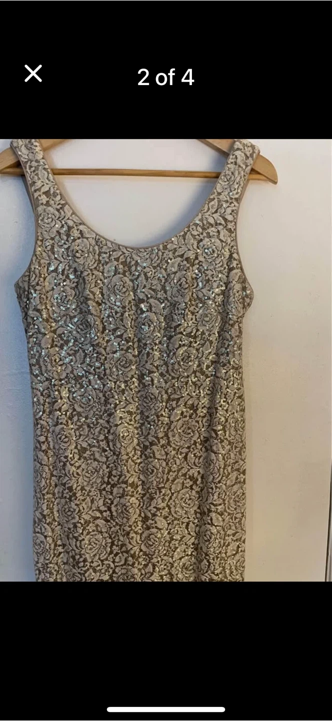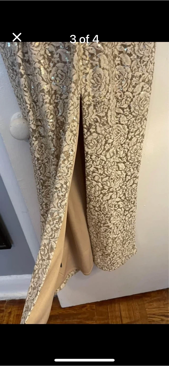 This elegant gown features a delicate lace overlay with sparkling sequin embellishments. It has a sleeveless design and a flattering silhouette with a subtle side slit. It's perfect for special occasions like weddings or formal events!