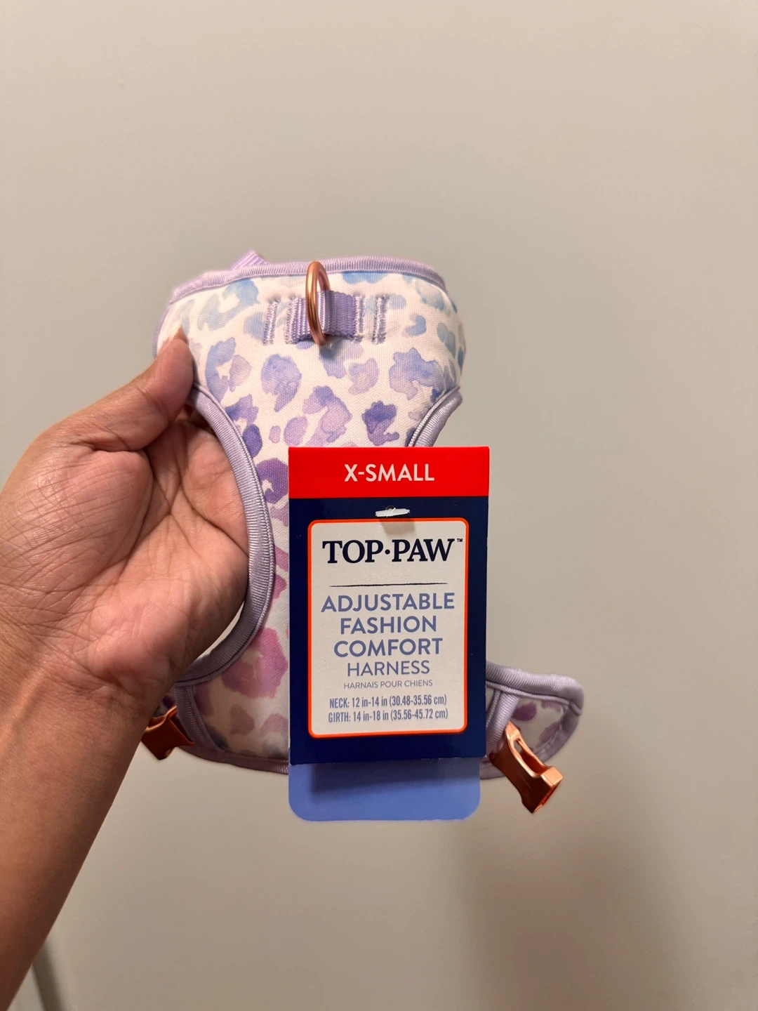 This is a TOP-PAW adjustable fashion comfort harness in X-Small. It's purple with a light blue and pink animal print. The neck size is 12-14 inches and the girth is 14-18 inches. This harness is designed for your dog's comfort and style!