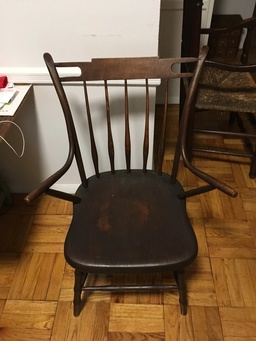 This is a dark wood armchair with a spindle back design. It has curved arms and a contoured seat for comfort. The chair's wood shows some signs of wear consistent with age. It's a sturdy piece that could fit well in a rustic or traditional setting.