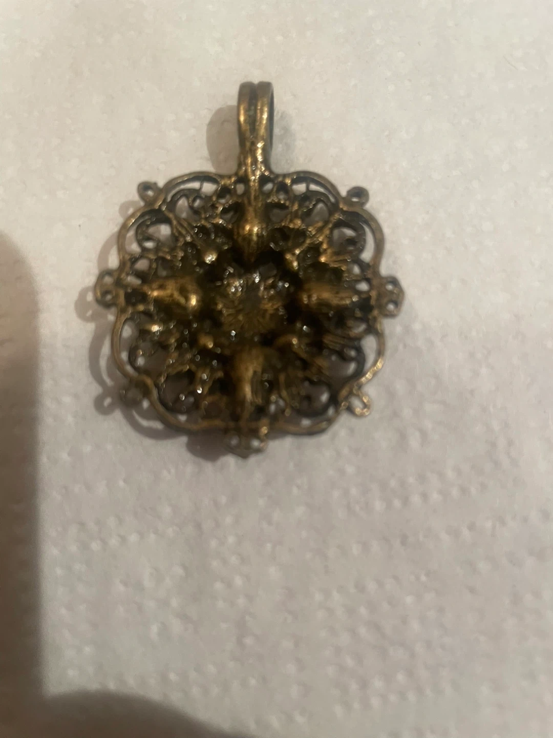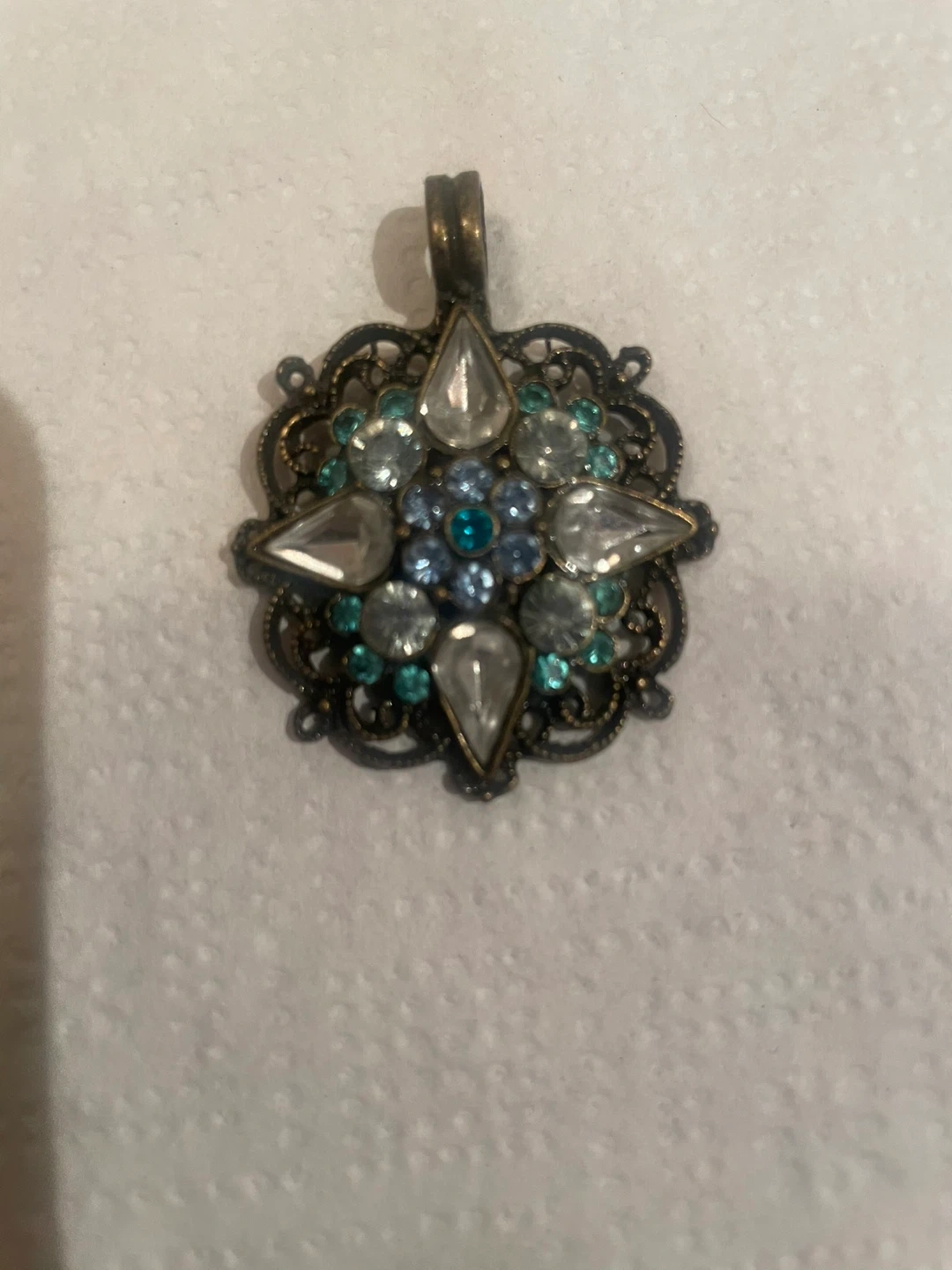 Ornate filigree pendant with blue and clear rhinestones