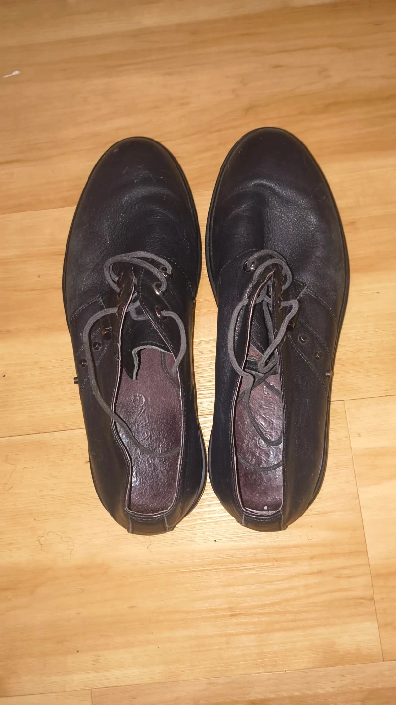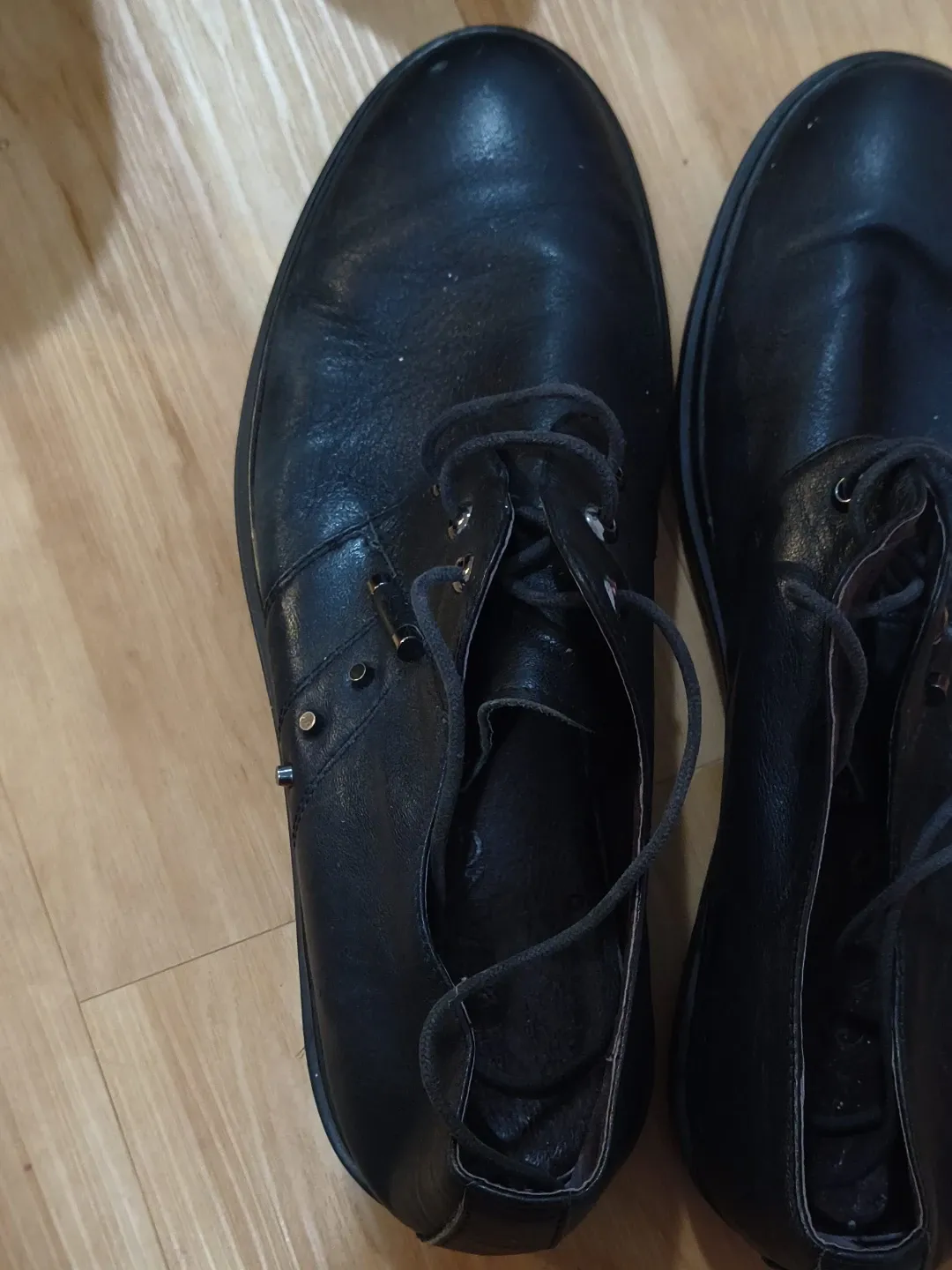 These are men's black leather dress shoes. They feature a lace-up closure and a classic round toe. Leather material construction.