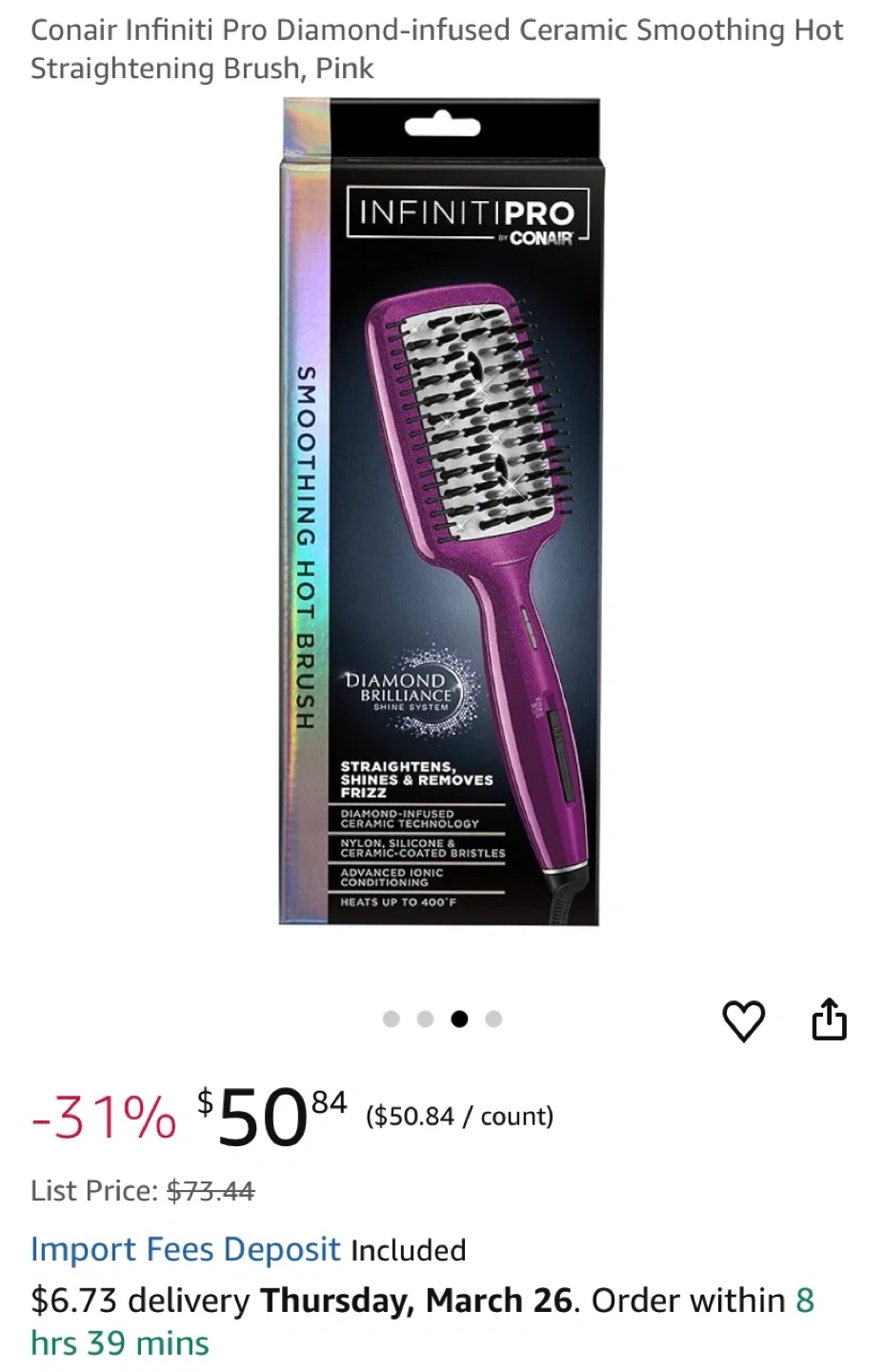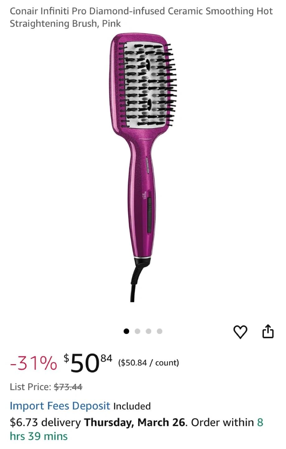 hot pink Conair Infiniti Pro smoothing hot straightening brush for easy hair styling. The bristles are designed for smooth, frizz-free results. 3 options.