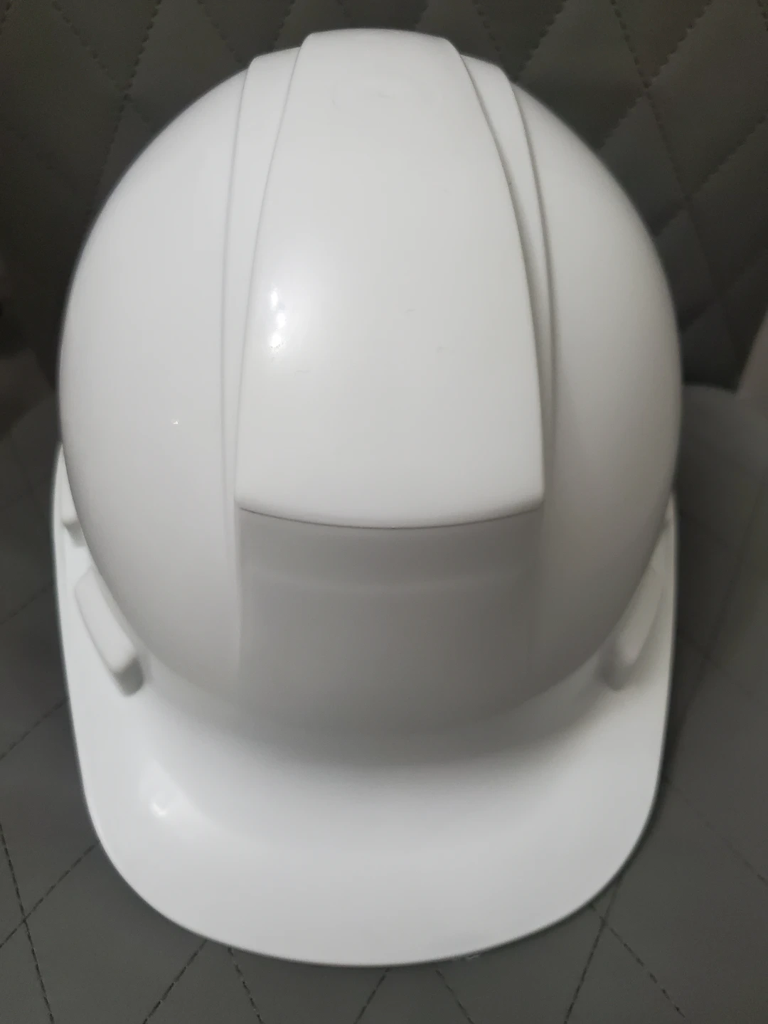 White construction safety hard hat. It features a comfortable adjustable suspension system for a secure fit. This hard hat meets safety standards for head protection on job sites.