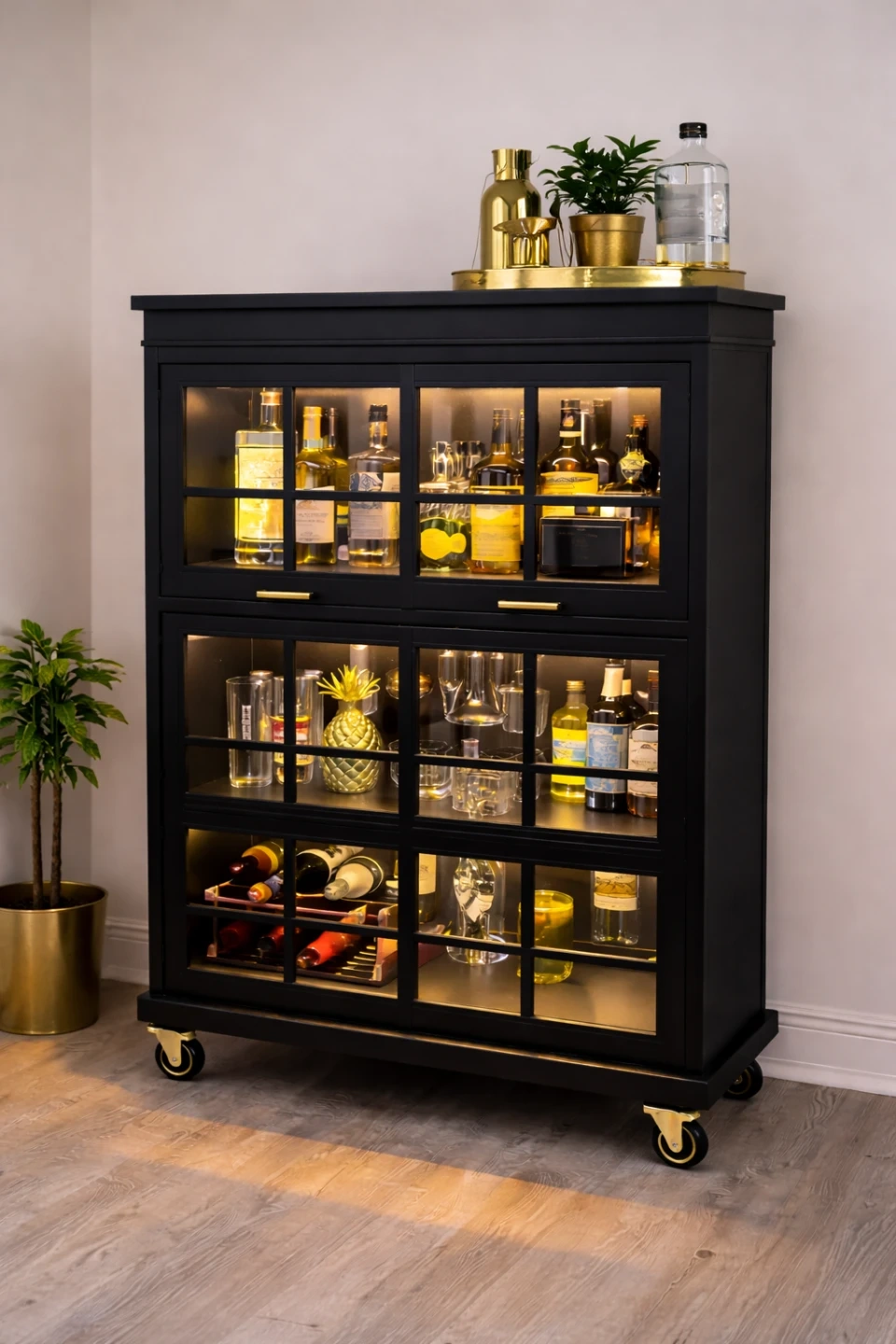 This stylish black bar cabinet features glass doors and internal lighting to showcase your collection. It's designed for convenient storage and display of beverages and glassware. The unit includes wheels for easy mobility.