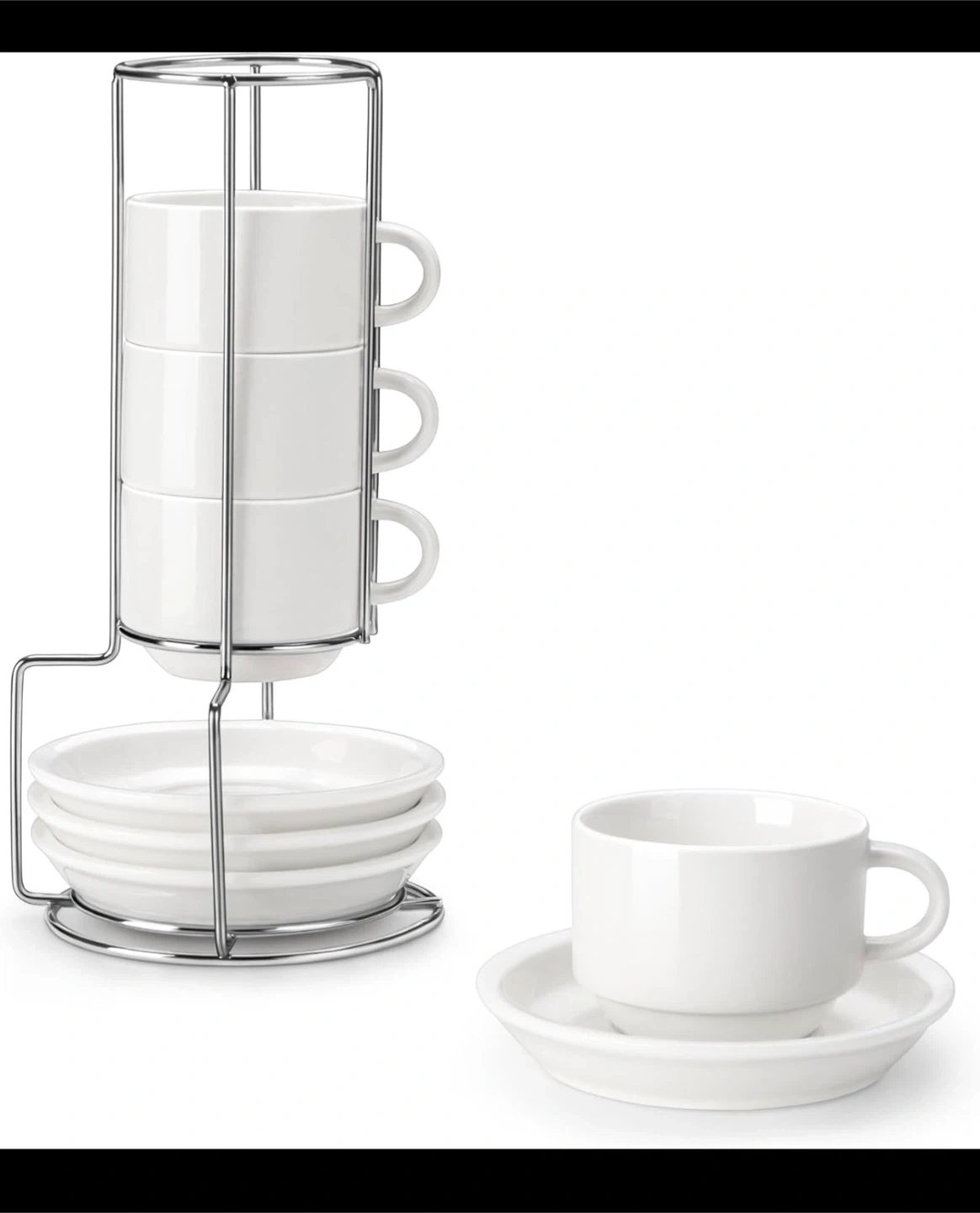 Set of 4 white ceramic espresso cups and saucers. Includes a chrome rack for stacking. Cups are stackable to save space. A classic design for any kitchen!