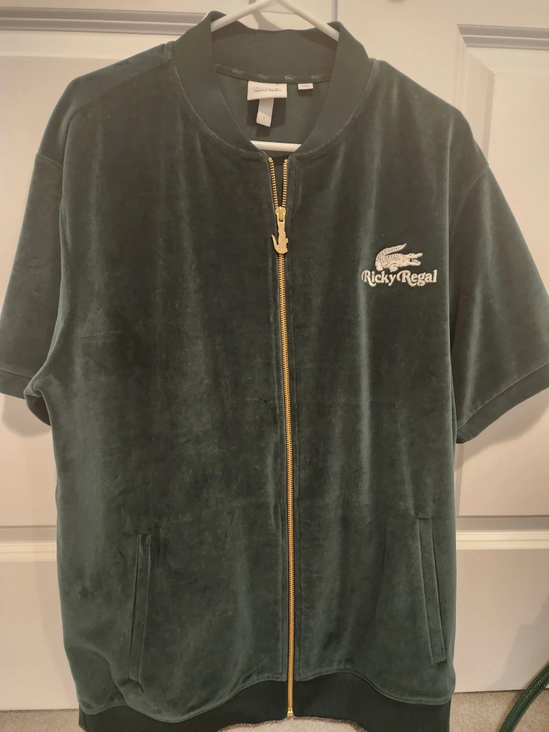 This short-sleeve velour bomber jacket is from the Ricky Regal x Lacoste collaboration. It's a stylish dark green colour with a gold zipper and features the iconic crocodile logo. It's a great piece for layering or as a statement jacket.