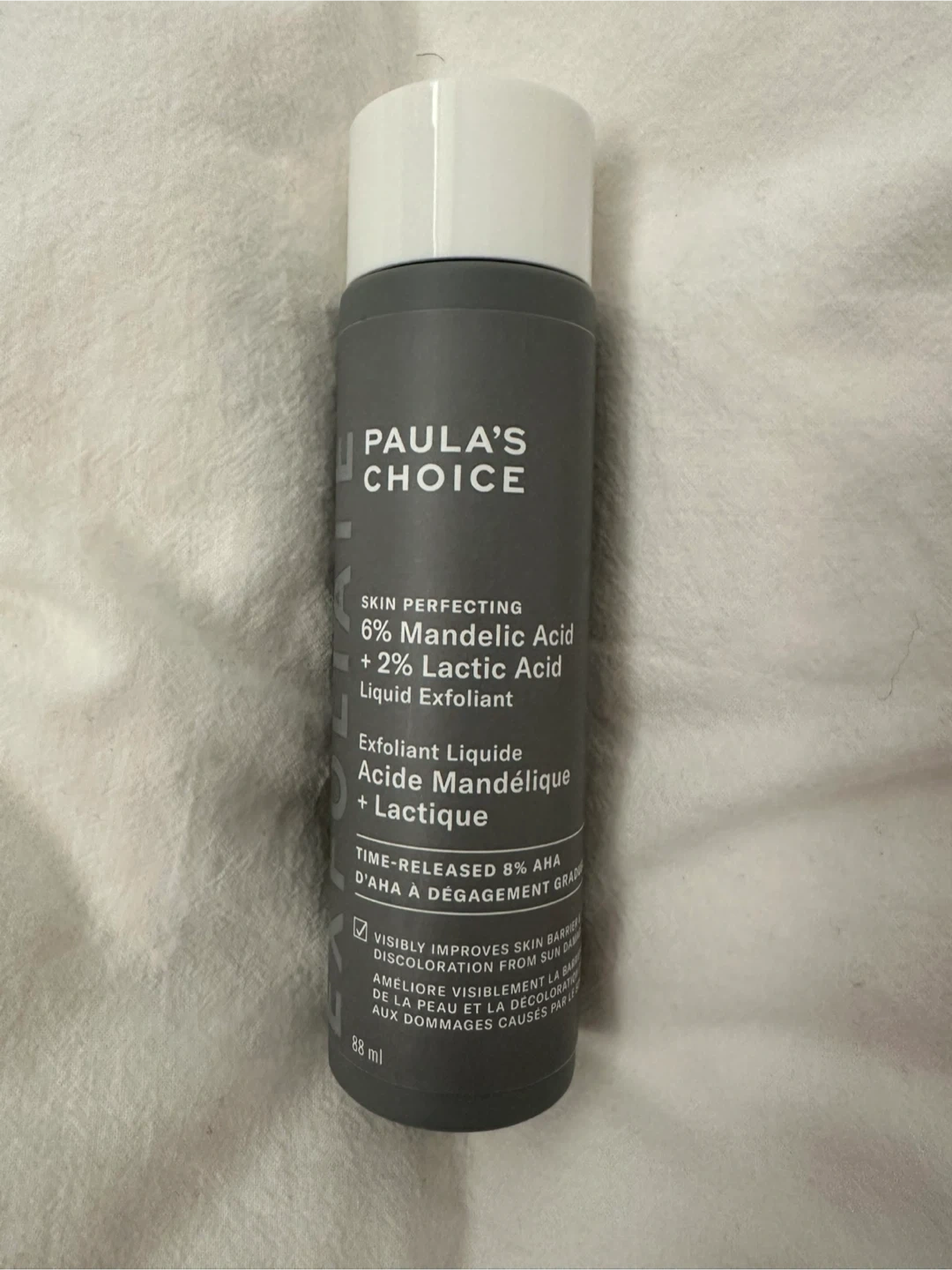 Selling a Paula's Choice Skin Perfecting 6% Mandelic Acid + 2% Lactic Acid Liquid Exfoliant. This is a liquid exfoliant that visibly improves skin barrier discoloration from sun damage. It comes in an 88 ml bottle