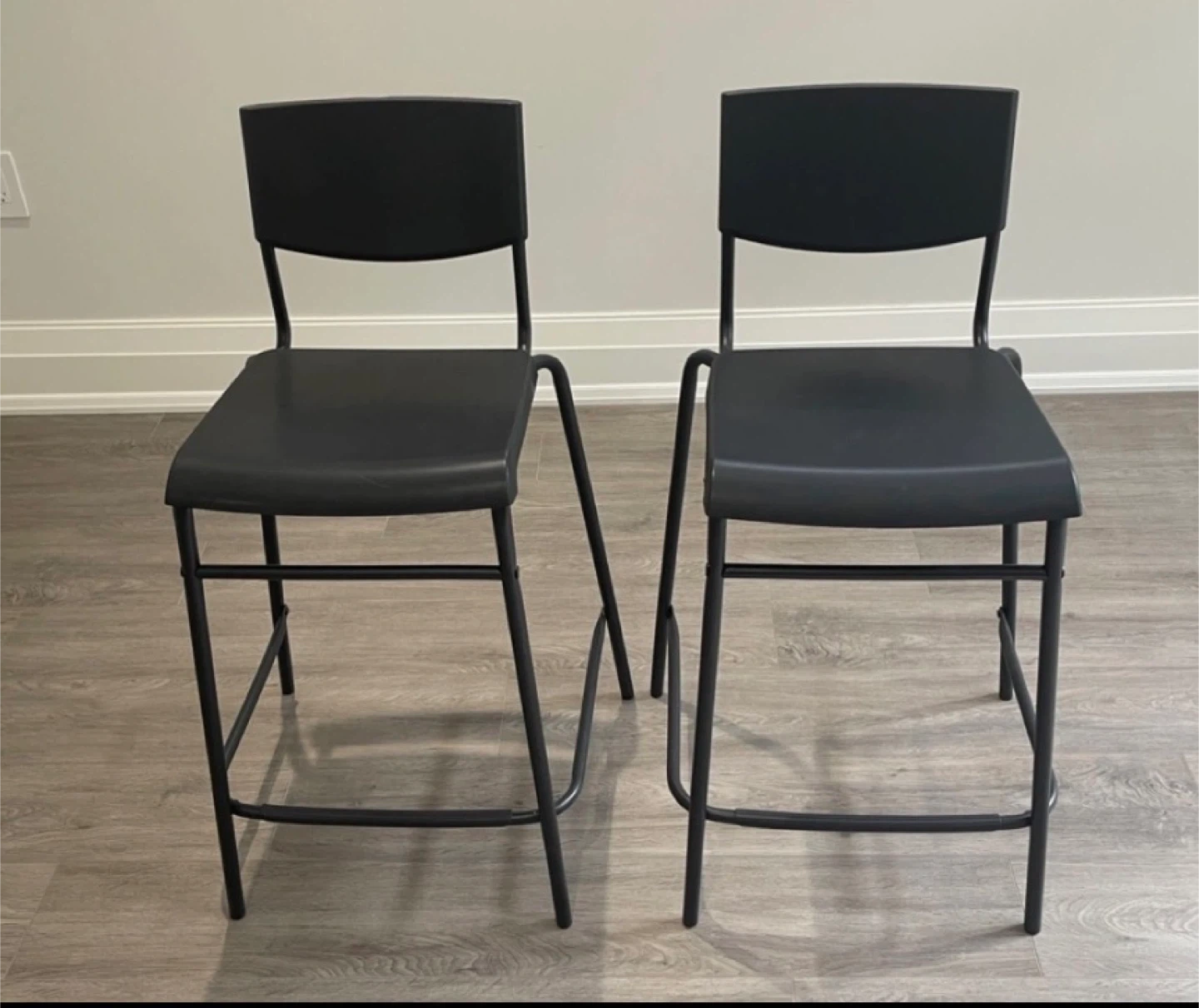 Two black IKEA STIG bar stools with backrests, counter height. Each stool measures 63 cm (24 3/4") high. These stools have a metal frame and plastic seat, perfect for your kitchen counter or bar area. Easy to wipe clean!