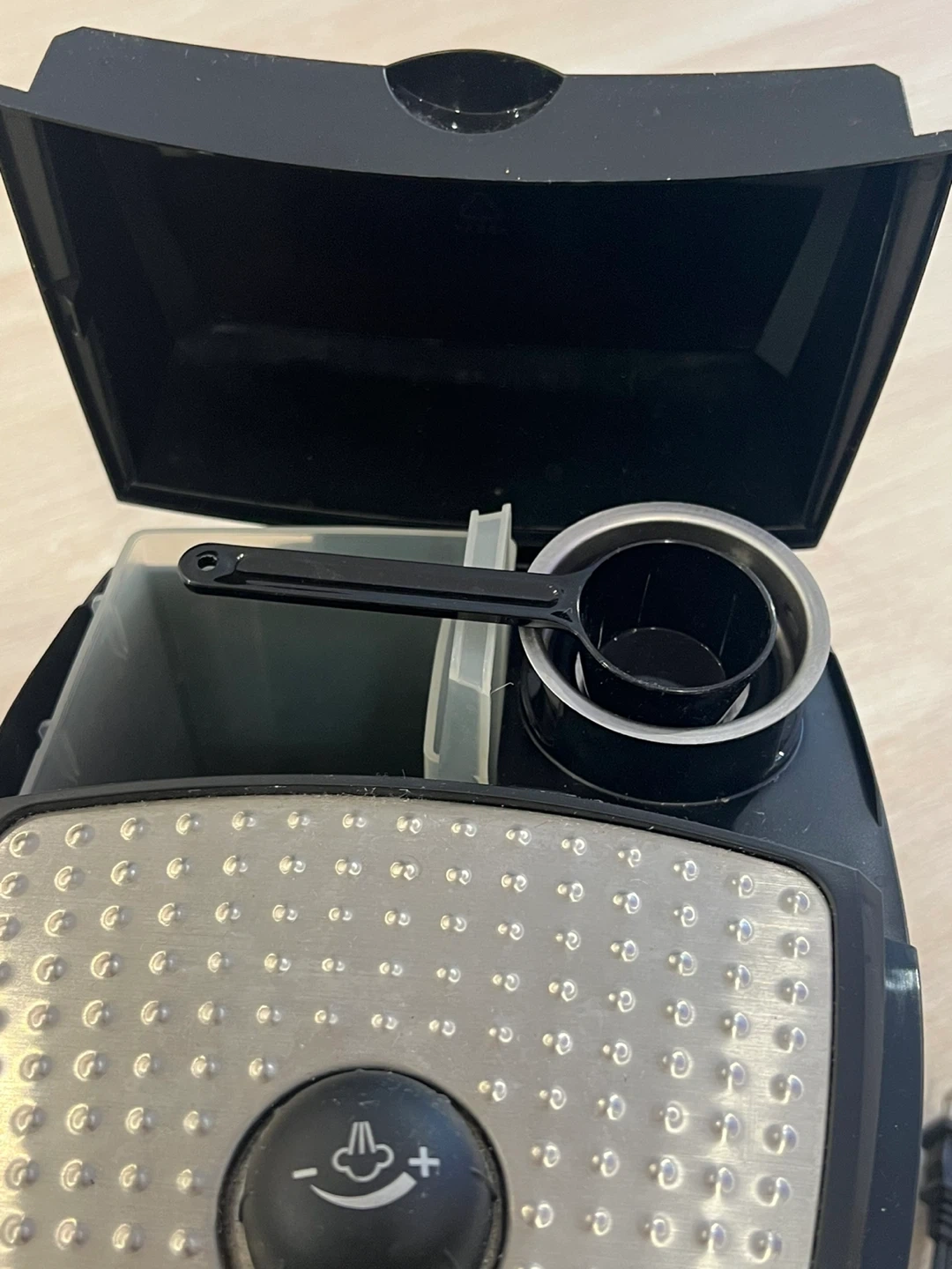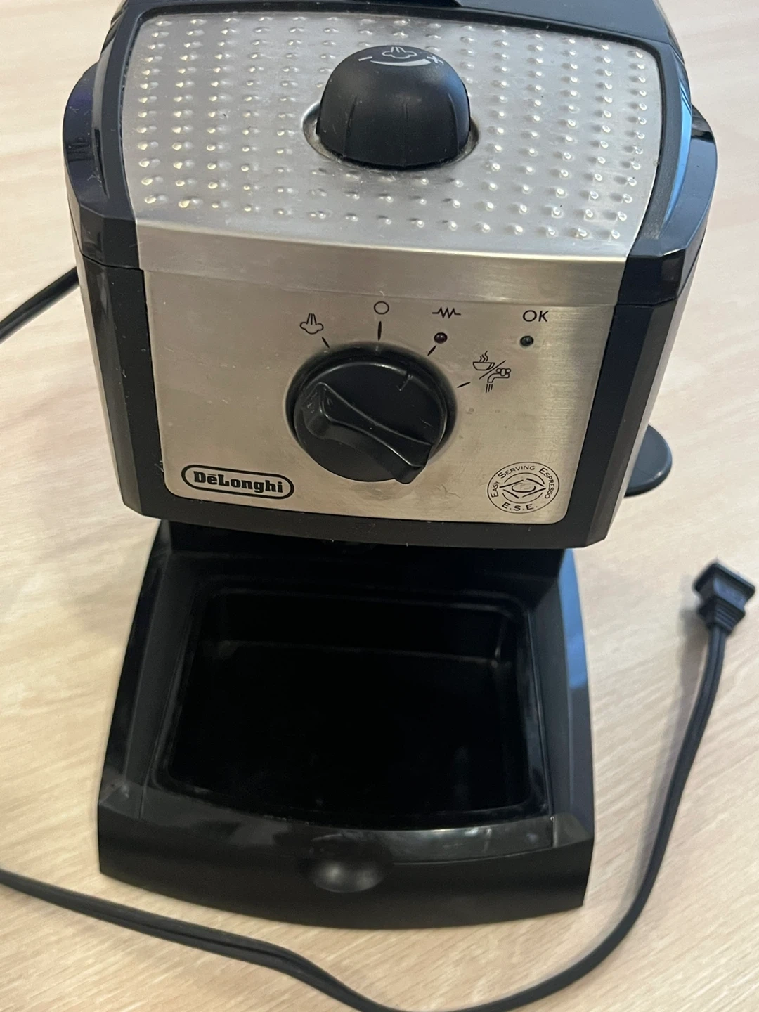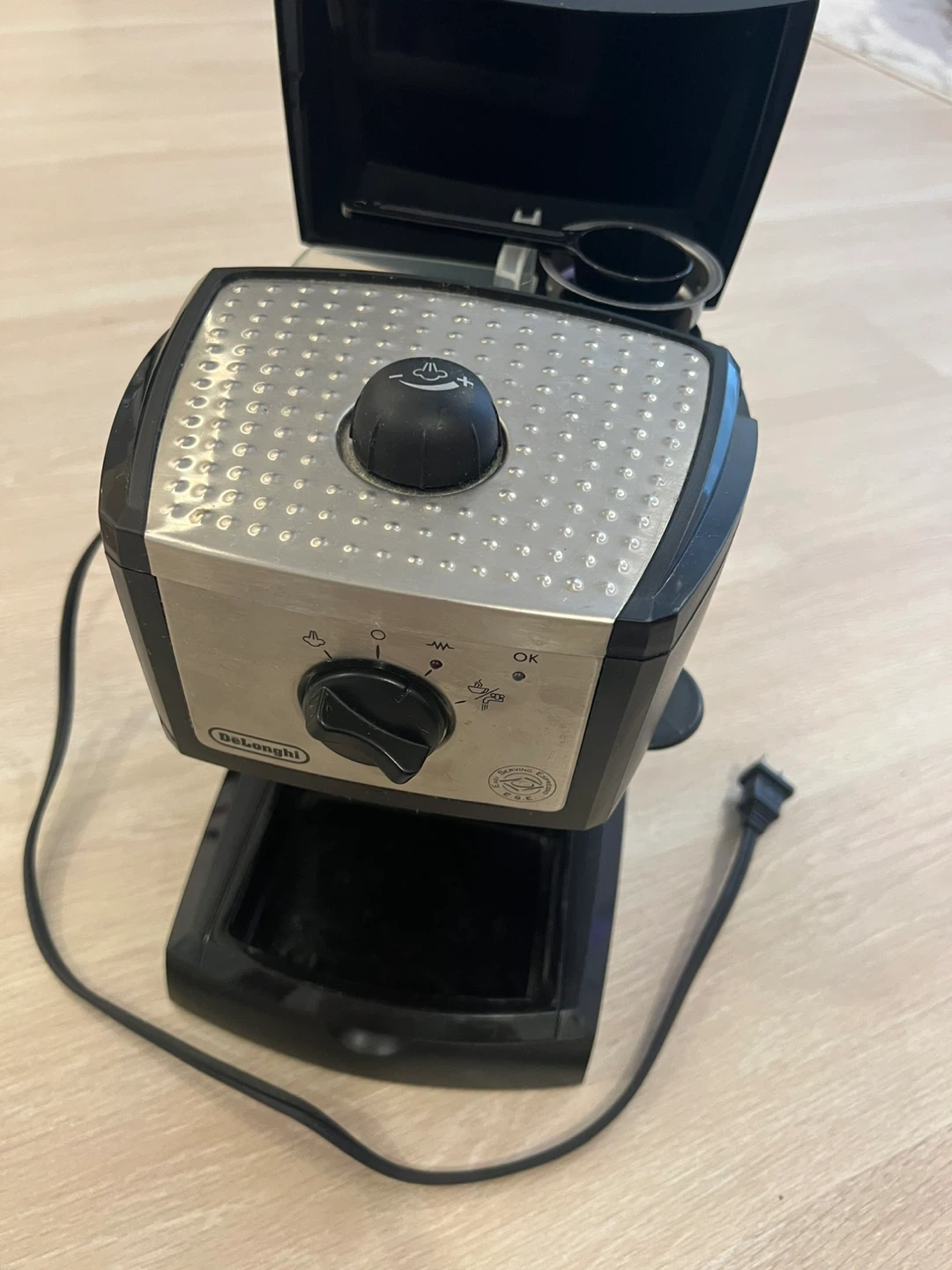 DeLonghi espresso machine. Features a stainless steel finish and comes with a measuring scoop. Simple dial control for operation.