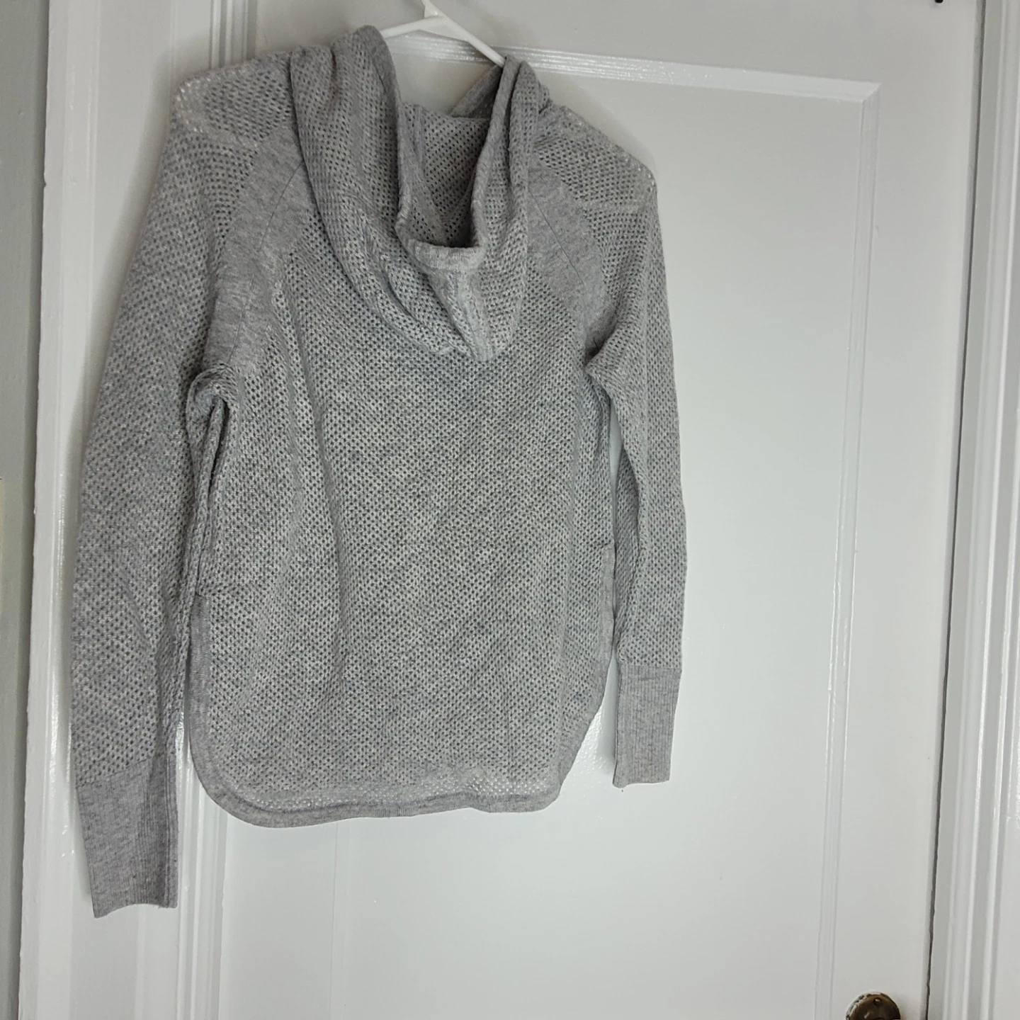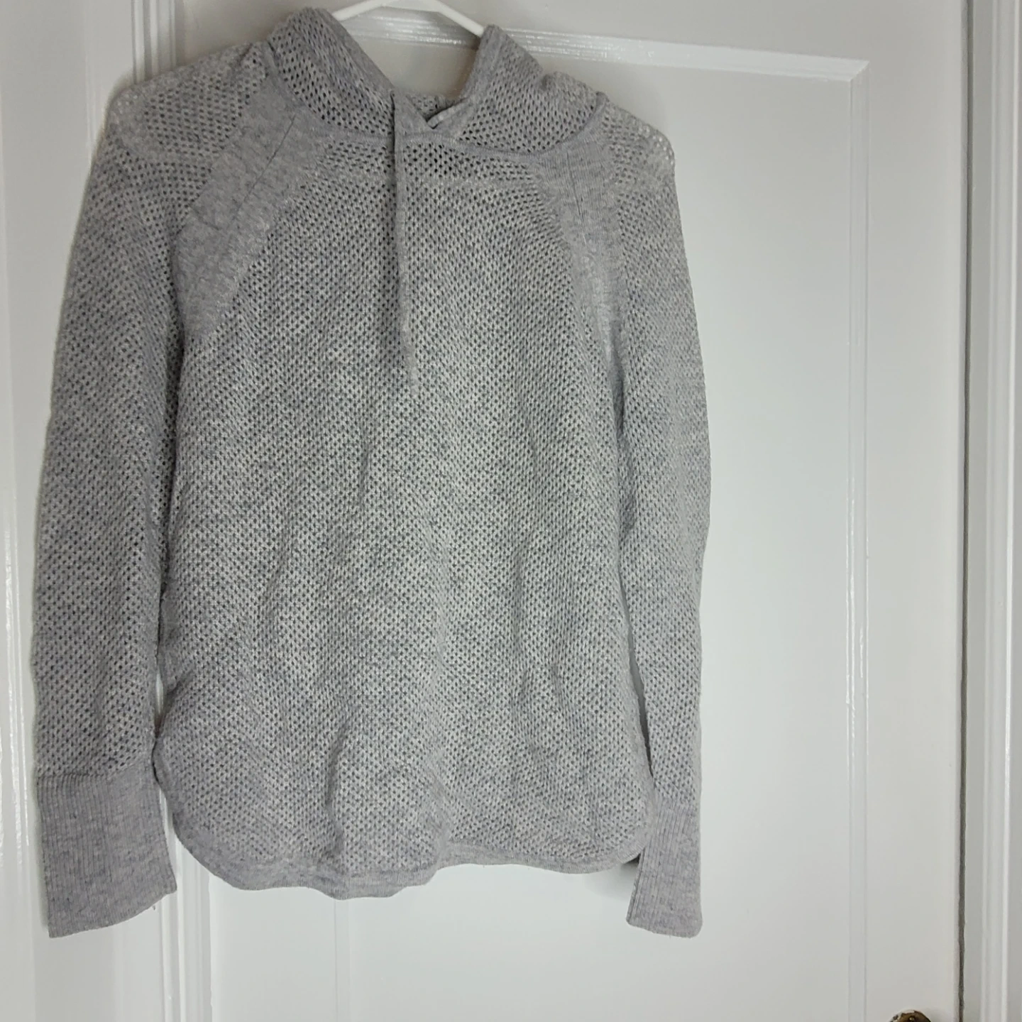 Banana Republic light grey hoodie. It's made of 100% cashmere. Size is XS/TP. It's a knit style with a drawstring hood.