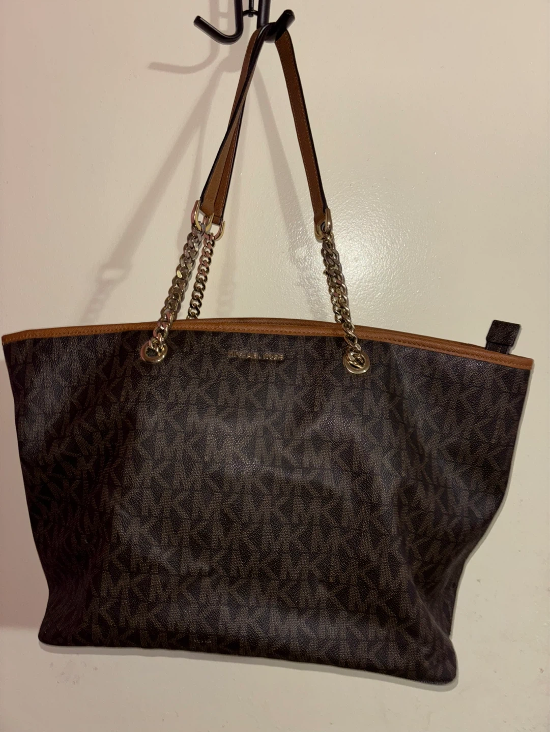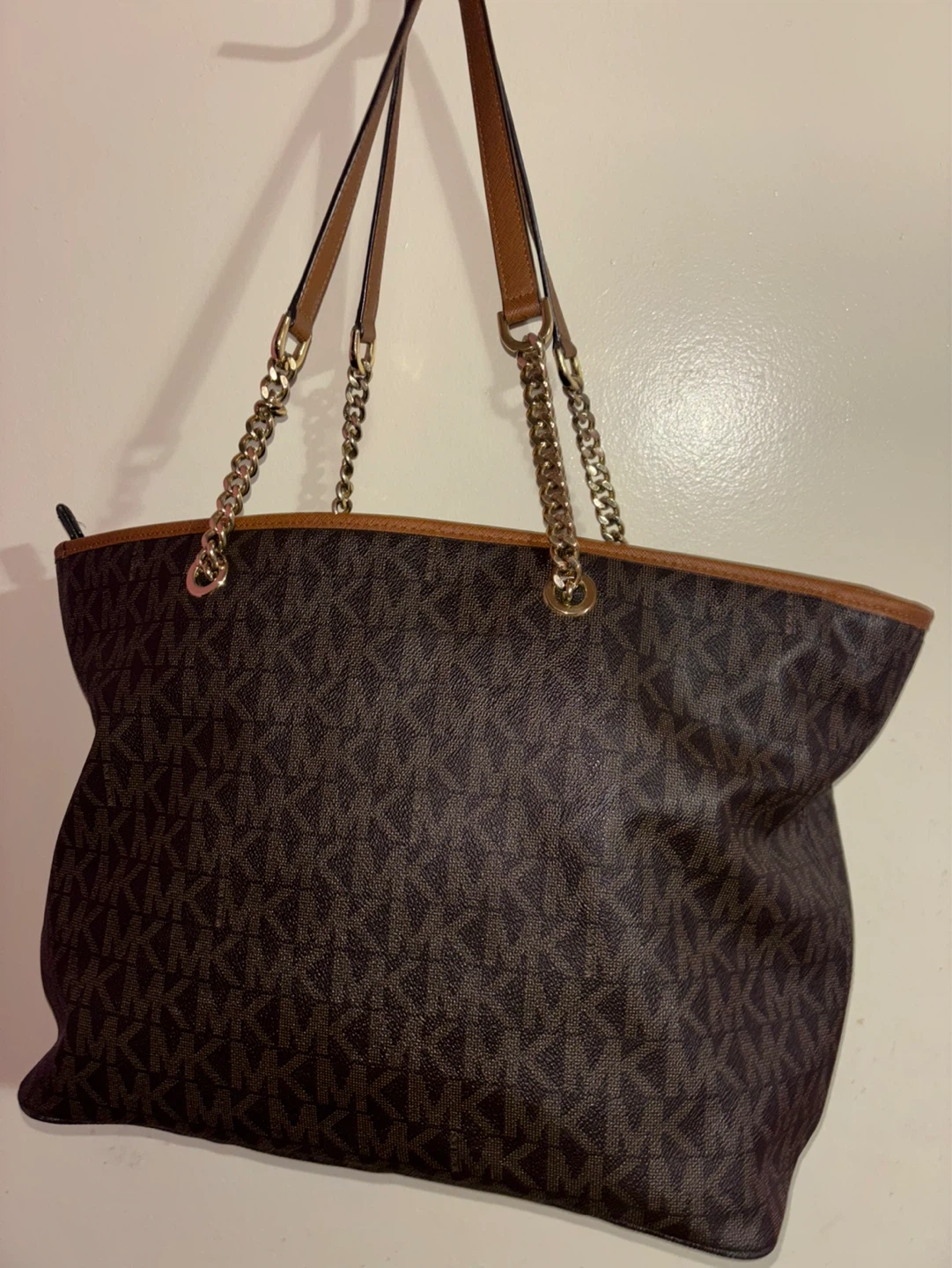 A classic Michael Kors tote bag in the signature brown MK print. It features leather trim and gold-tone chain detailing on the straps. The interior lining is printed with the Michael Kors logo. This spacious bag is perfect for everyday use, offering plenty of room for your essentials.