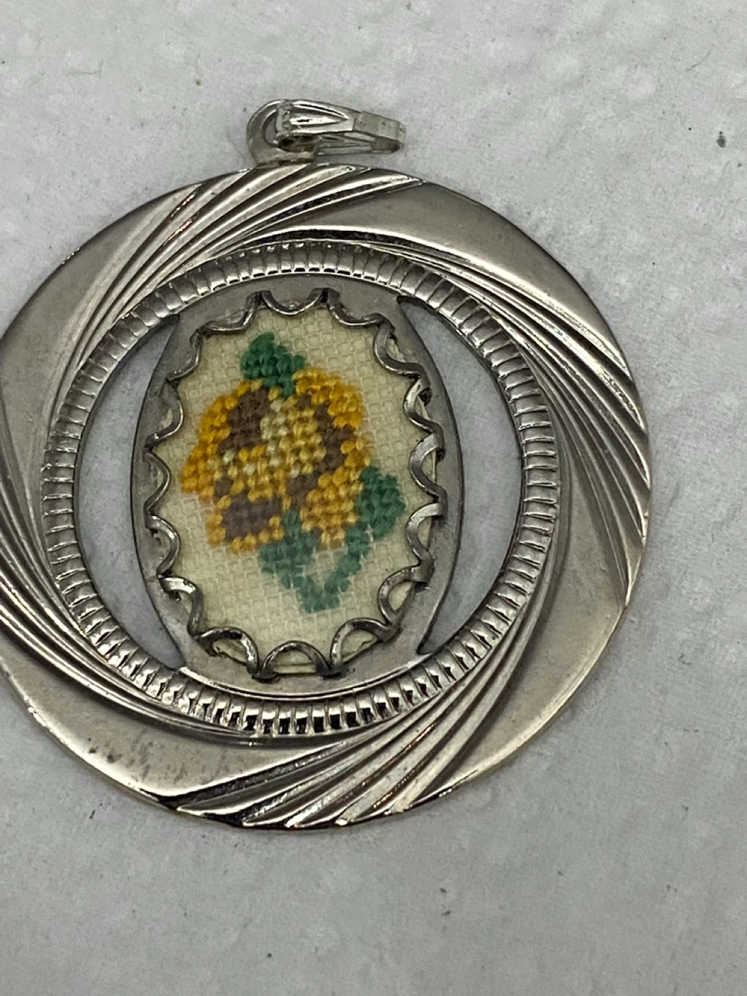 Here's a charming pendant featuring a delicate floral needlepoint design! The pendant has a silver-tone metal frame with a unique, swirling pattern. The needlepoint itself showcases a lovely yellow and brown flower with green accents on a cream-coloured background. It's a sweet and classic piece to add to your collection this is 45 yrs old