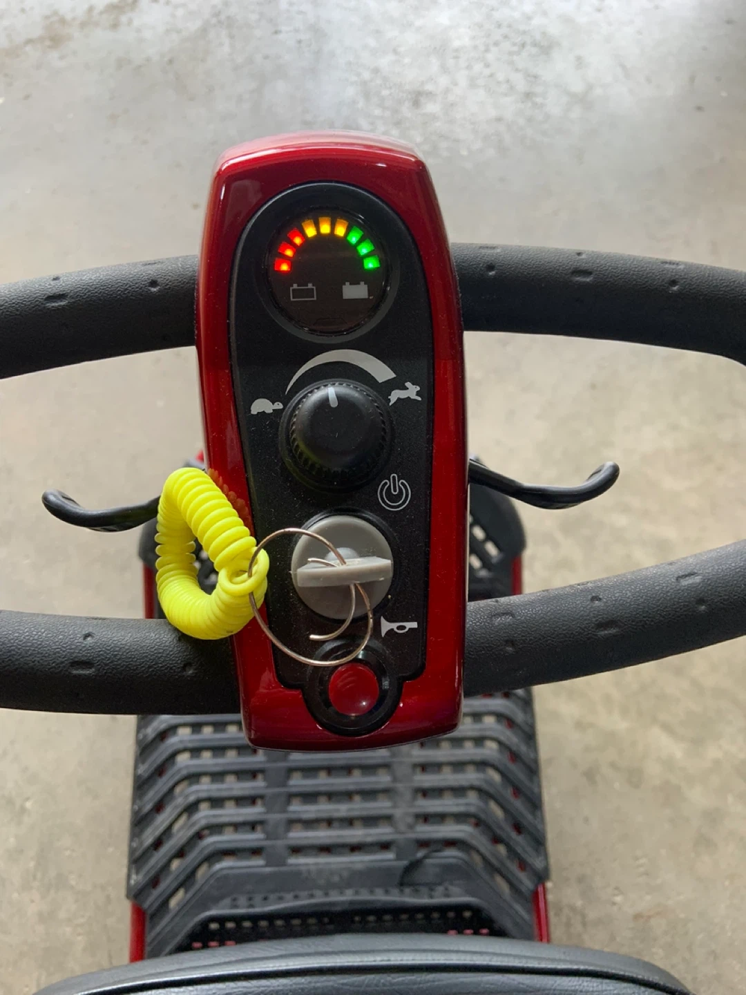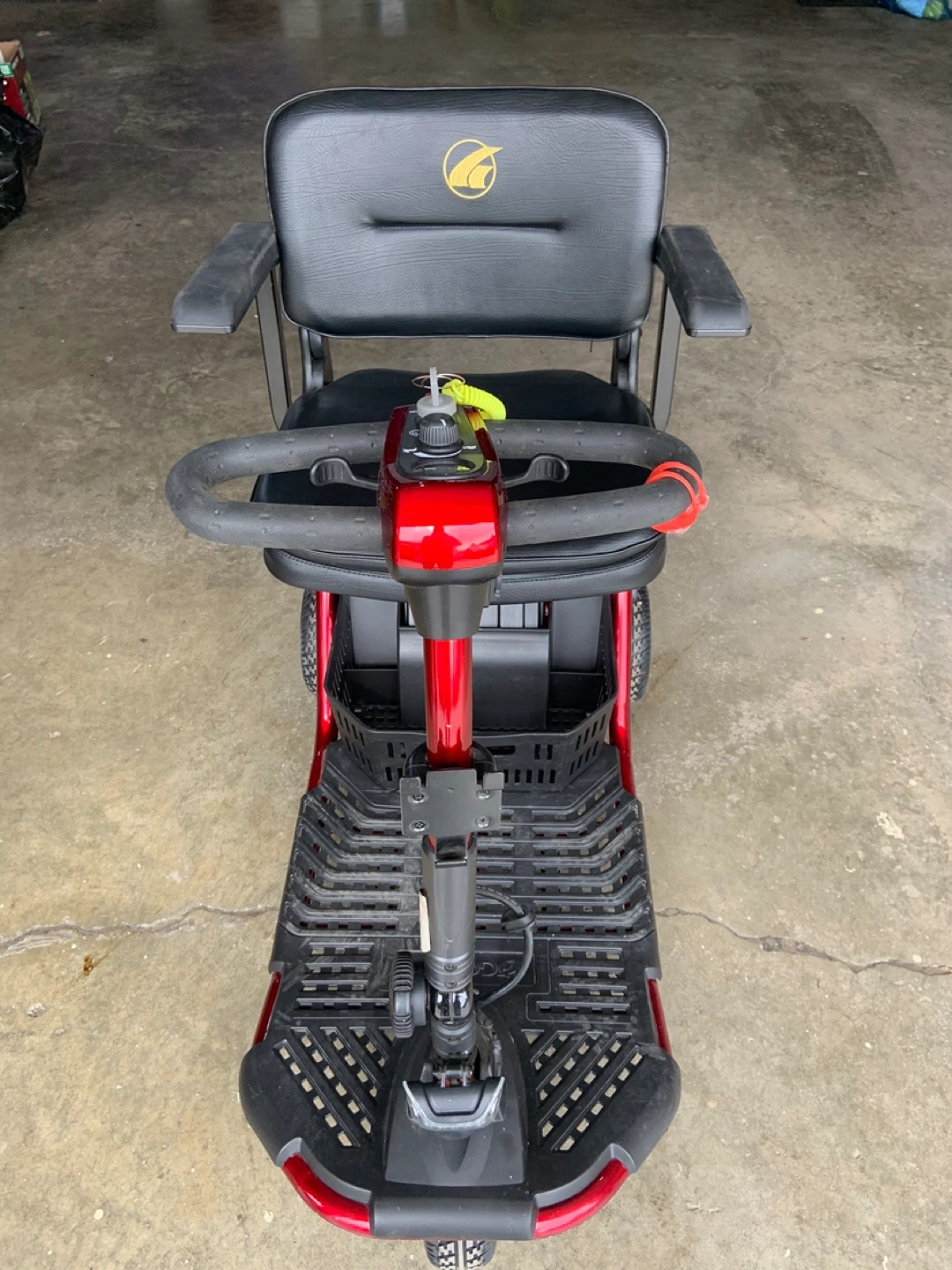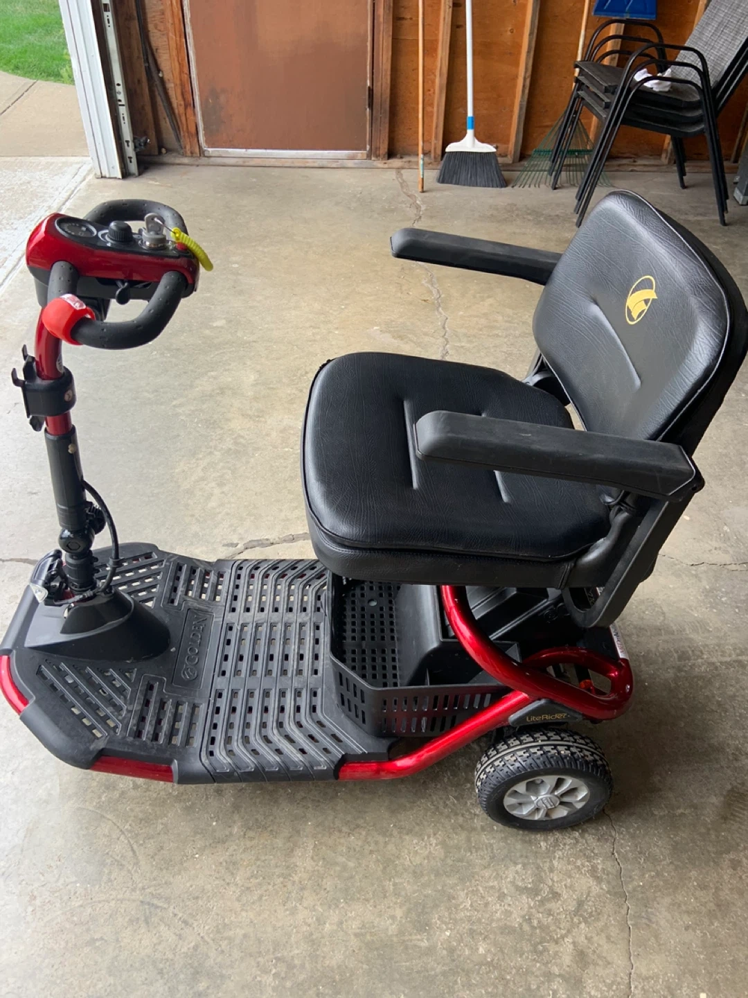 This Golden LiteRider mobility scooter is a reliable way to get around. It features a comfortable black seat and a red frame. Includes newer battery and is ready for use!