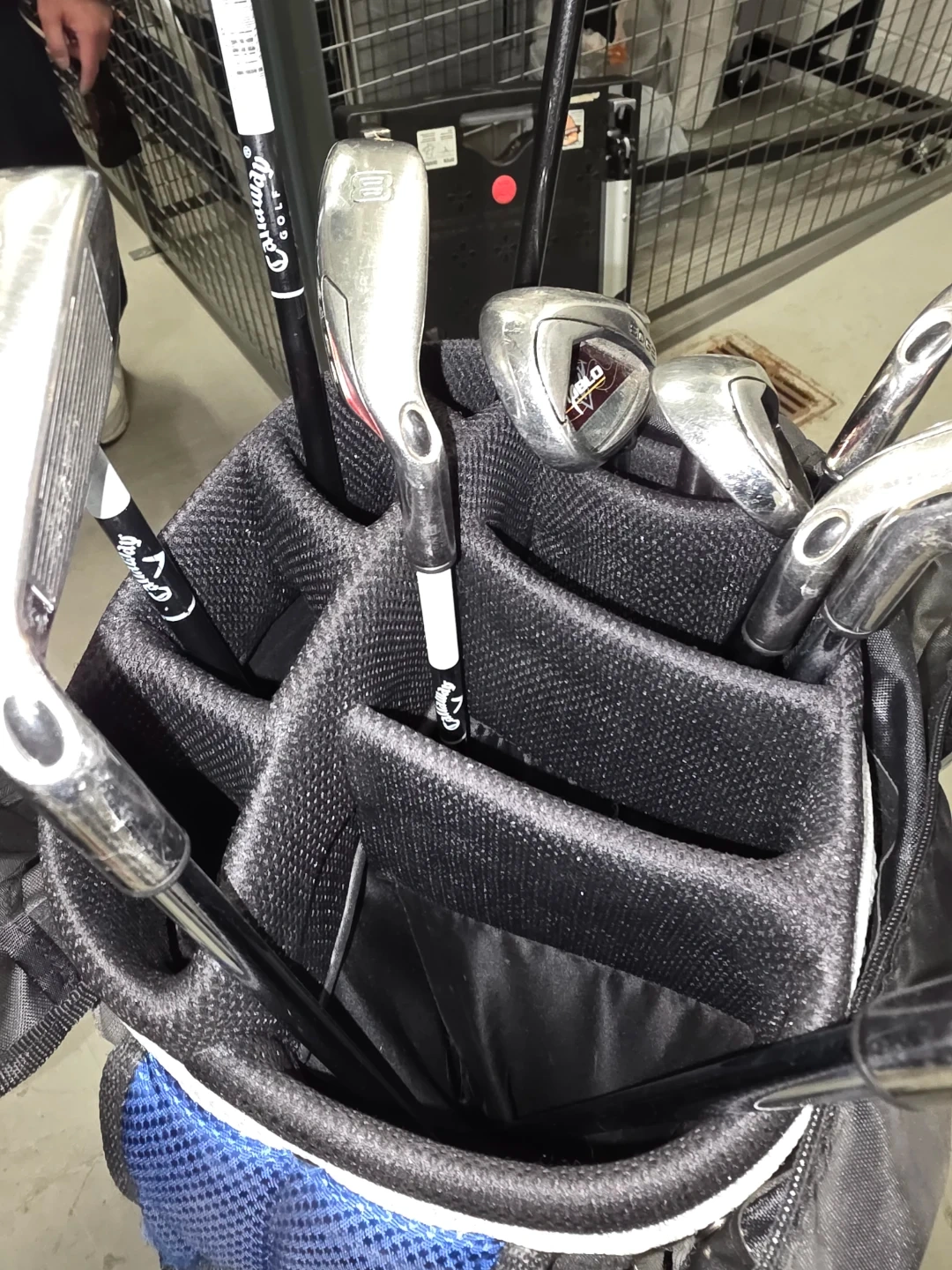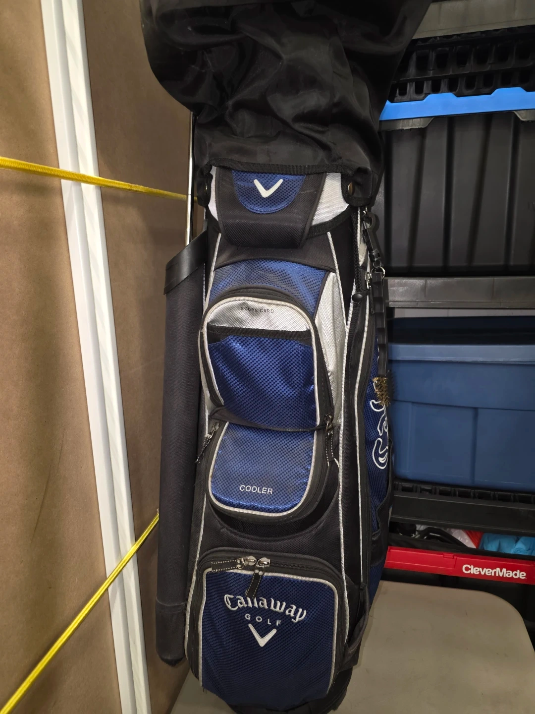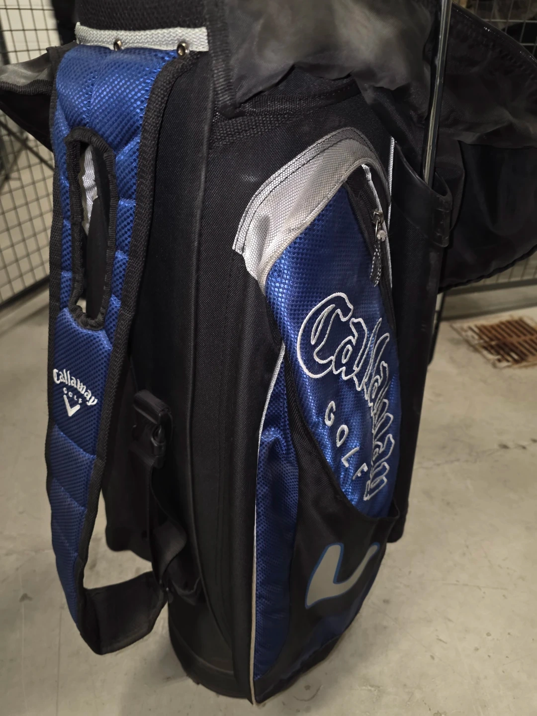 Bag: Callaway Cart Bag in great condition (Black, Blue, and Silver with multiple pockets, including an insulated cooler pocket for drinks).