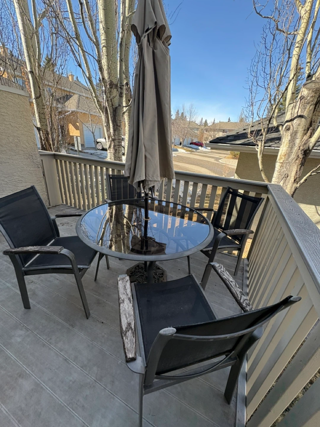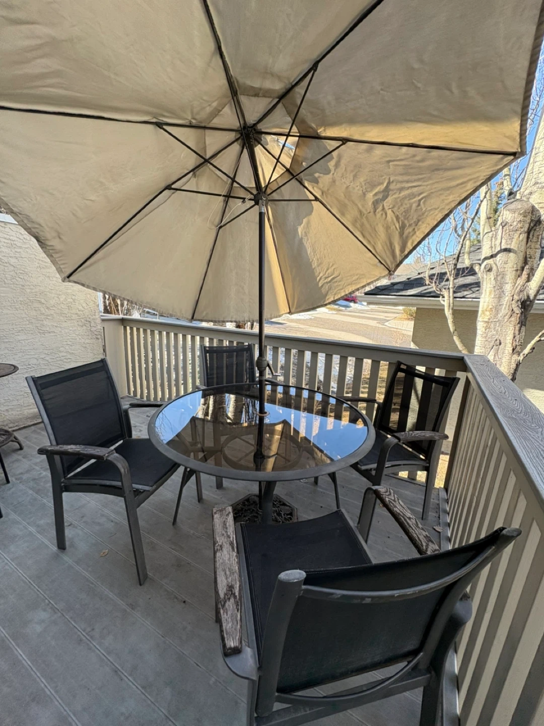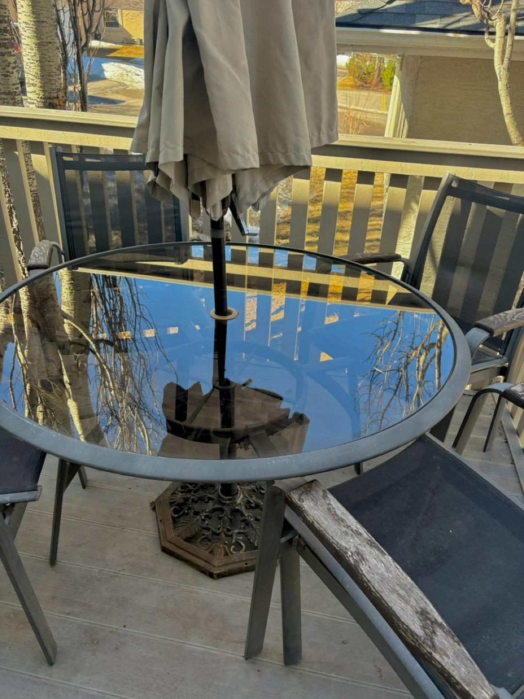 Round glass top patio table with four black mesh chairs and a large beige umbrella. Chairs have metal frames with wooden armrests. Umbrella fabric is slightly faded and needs manual raising. It stays up when angled. Needs repair but still functional. Table has a weighted, decorative metal base.
