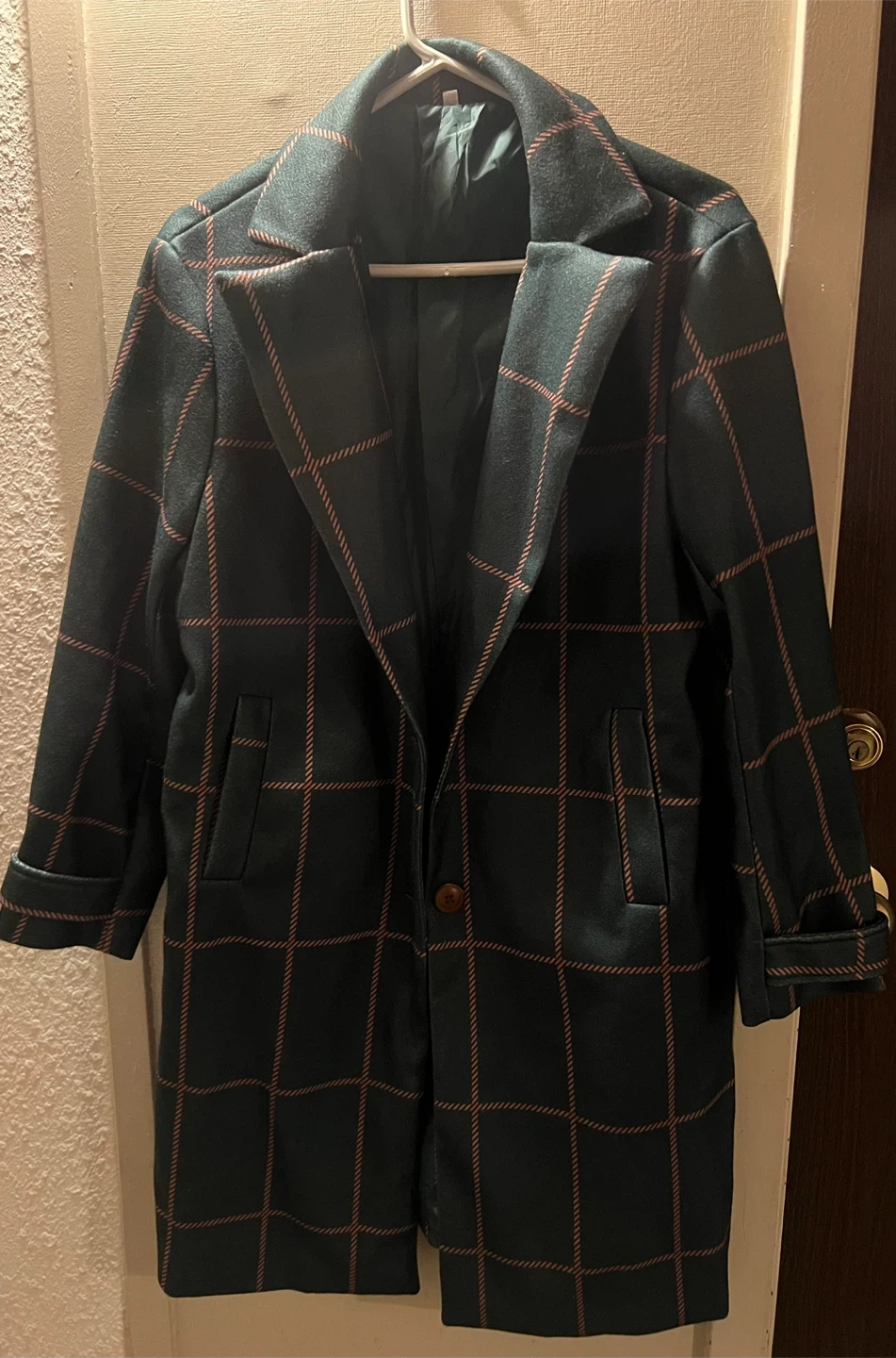This stylish coat features a dark green base with a pink plaid pattern. It has a classic collar and button-front closure. The material feels like a wool blend. It's perfect for cooler weather! New never worn