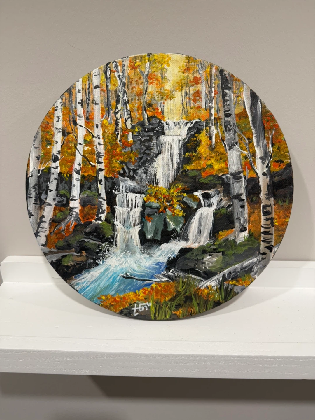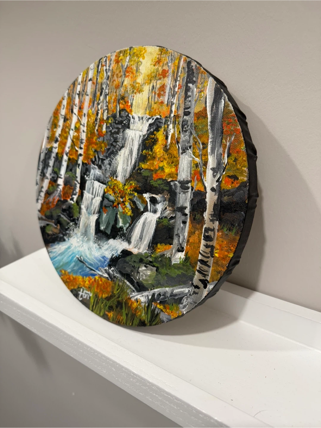 This original acrylic painting on a 10” back-stapled canvas showcases an autumn scene with three waterfalls, bringing warmth and movement to any space.