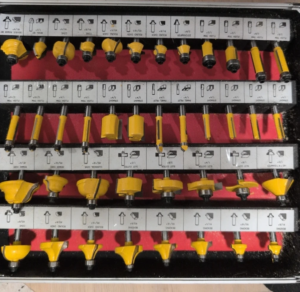 This is a 100-piece router bit set with various shapes and sizes. It includes straight bits, round over bits, flush trim bits, and more. All bits come in a durable carrying case for easy storage and transport.