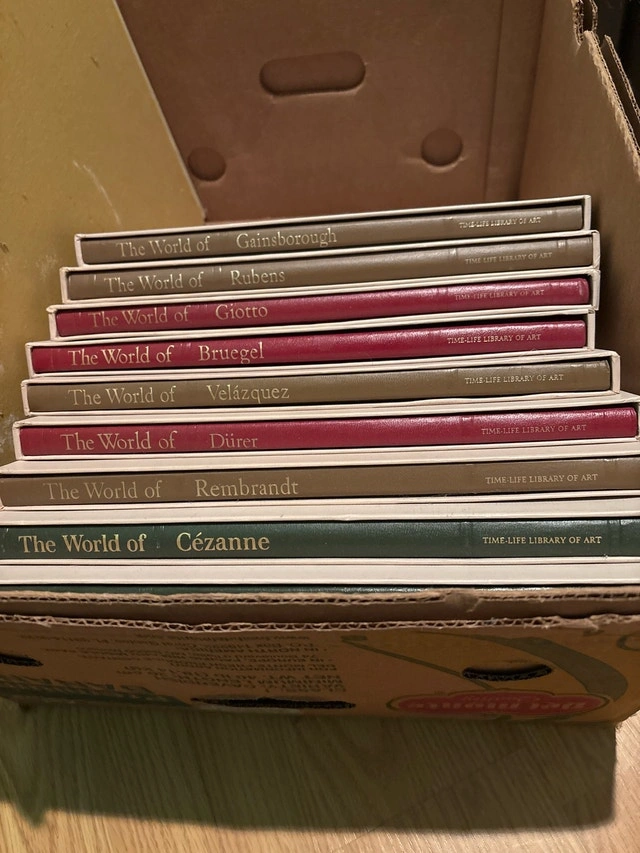 This is a set of 9 Time Life of Art series books featuring Velasquez, Rembrandt, Durer, Cezanne, Manet, Gainsborough, Rubens, Giotto, and Bruegel. They are in like-new condition, barely used, with crisp pages and great outer box covers. Cash accepted. Curbside pickup is available.