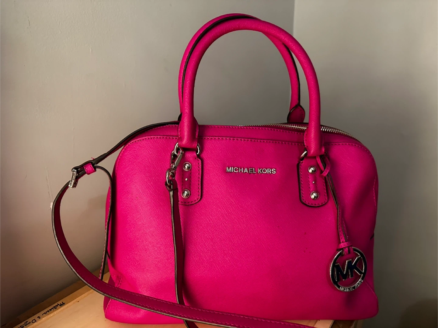 This is a Michael Kors satchel handbag in a vibrant pink colour. It's made of textured leather. Includes a detachable shoulder strap for versatile wear.