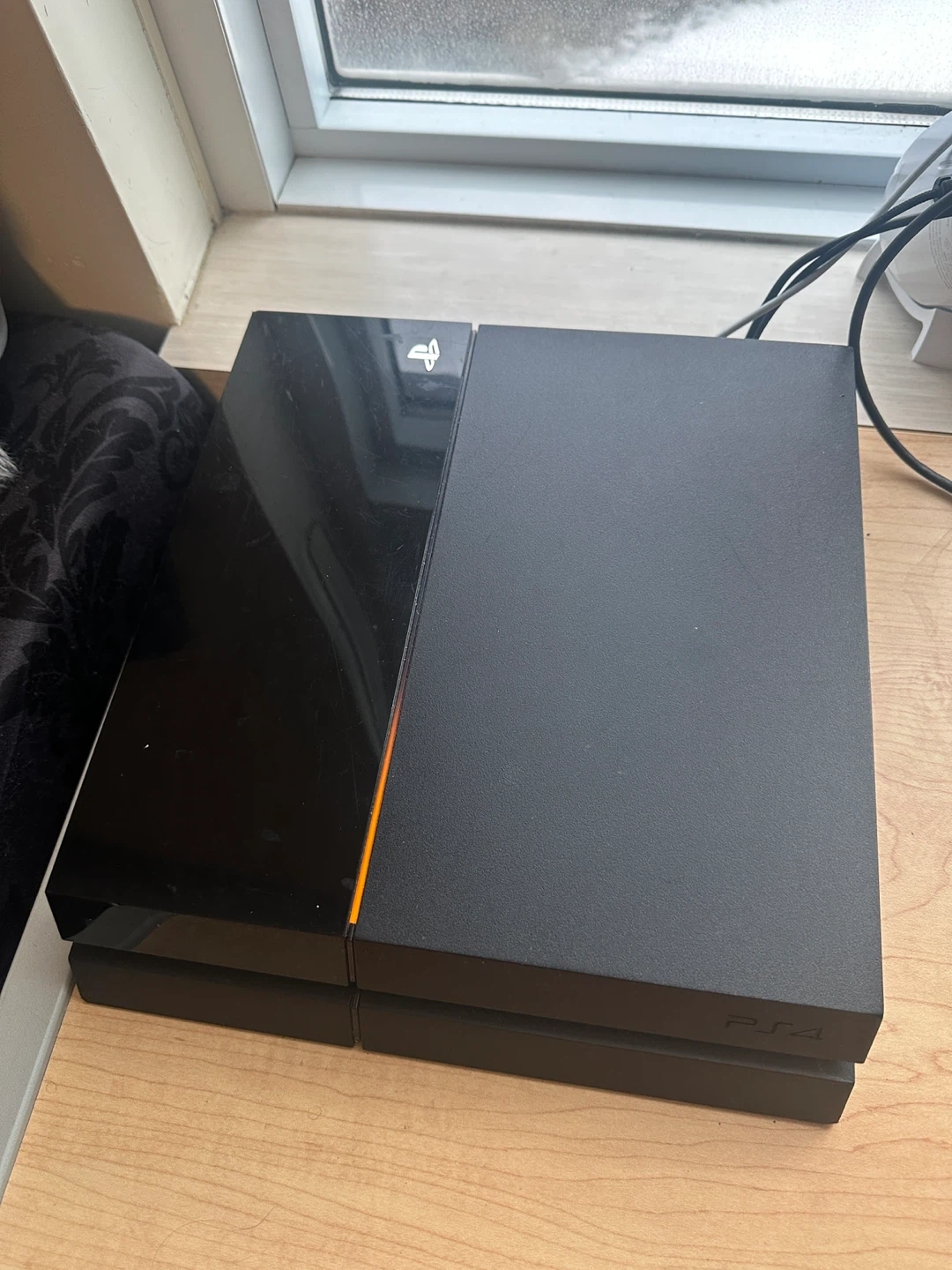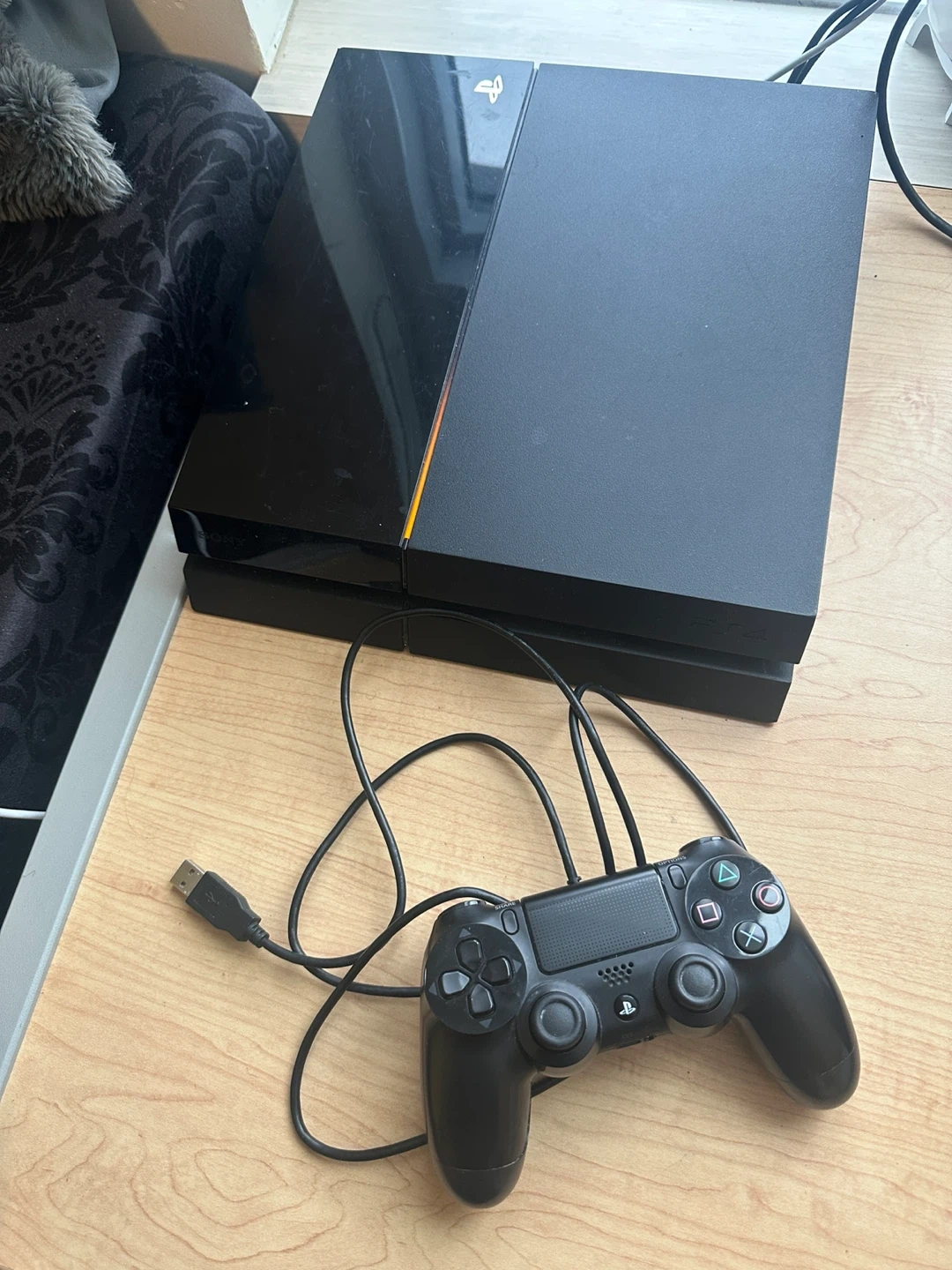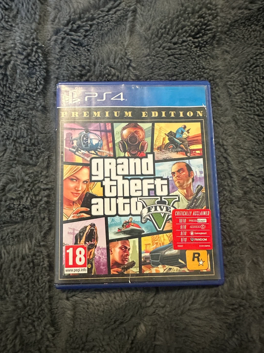 Selling a black PlayStation 4 console with one controller and the Grand Theft Auto V Premium Edition game. This bundle includes the console, a controller with its charging cable, and the game disc.