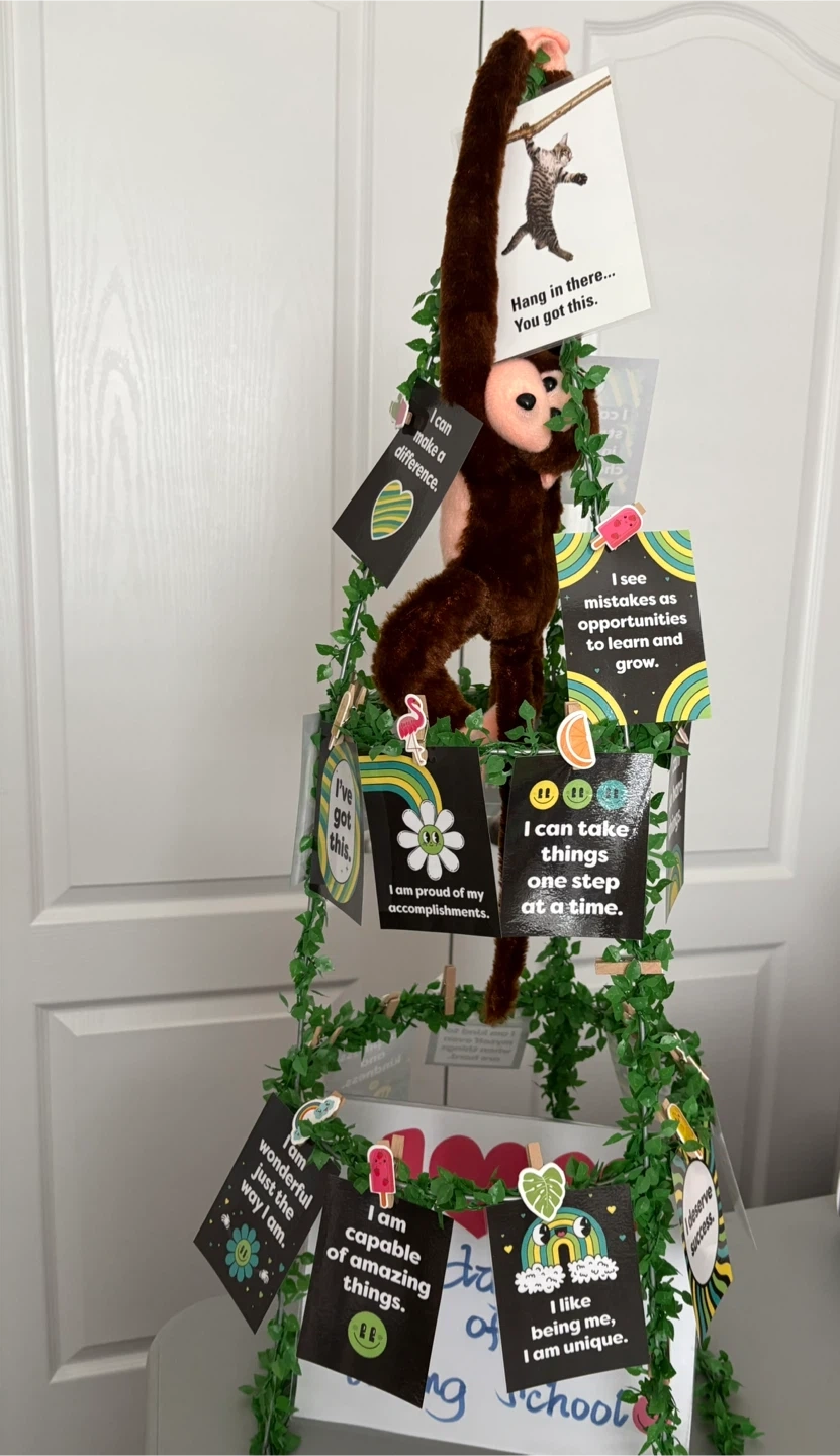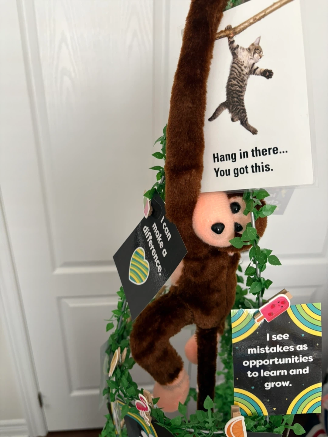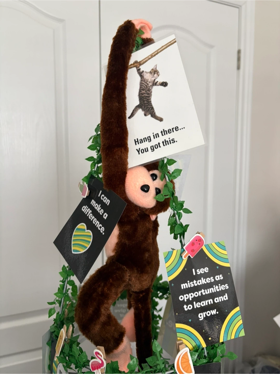 This fun plush monkey is decorated with inspirational quote cards for encouragement. It's perfect for a classroom or child's room. Cards include messages like 'Hang in there... You got this!' and 'I can make a difference and more! 21 cards in total! Cards are laminated.