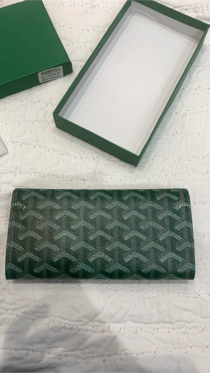 This is a Goyard wallet in a classic green colour. It features the iconic Goyardine canvas and a secure snap closure. The interior has multiple card slots and a zippered coin pocket. It comes with its box.