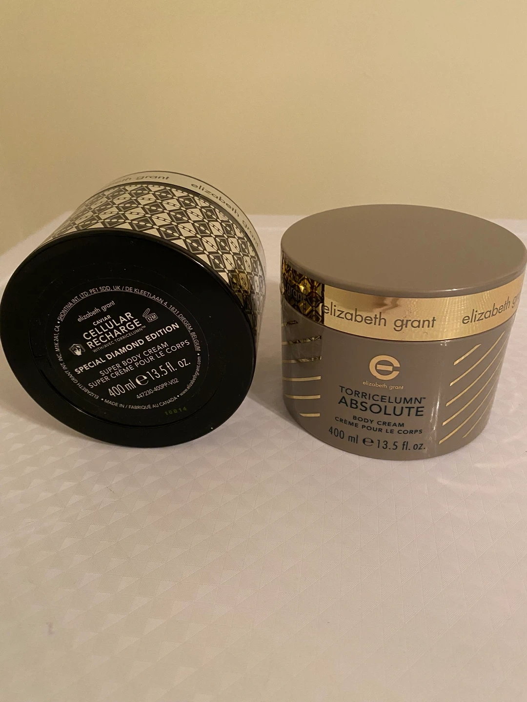 Two Elizabeth Grant body creams, including a Cellular Recharge Special Diamond Edition and a Torricelumn Absolute. Each jar contains 400 ml (13.5 fl. oz.) of cream.