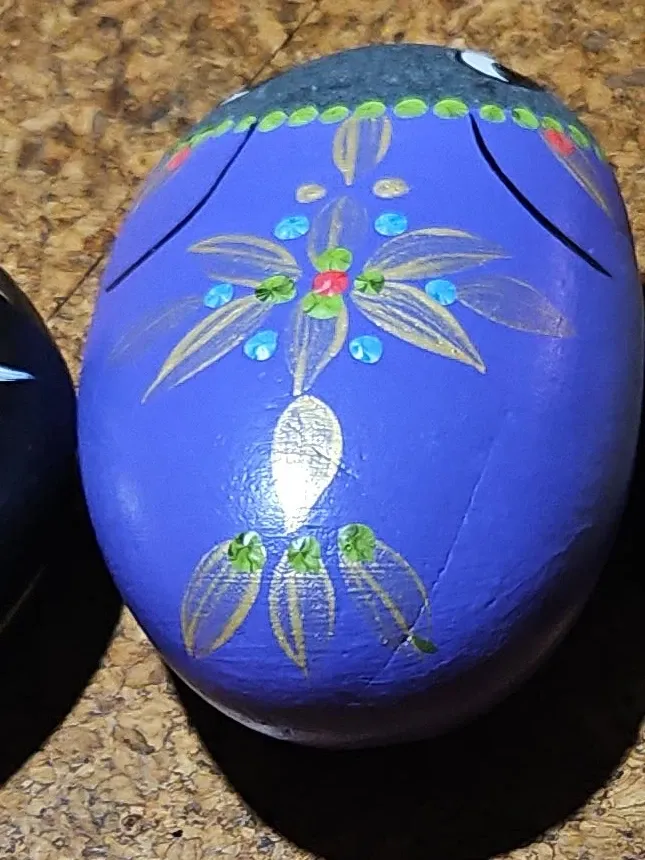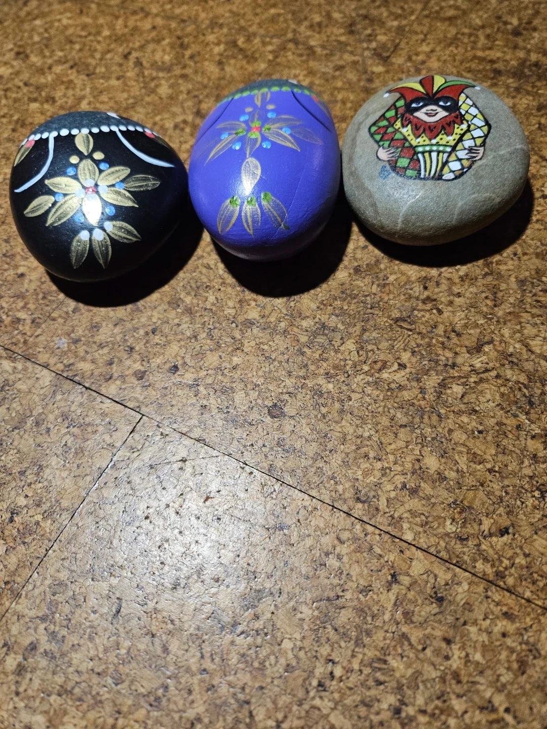 This is a set of three unique hand-painted decorative stones. They feature distinct artistic designs, including floral patterns and a jester motif. Each stone is a unique piece of art, perfect for adding a touch of charm to your home decor.