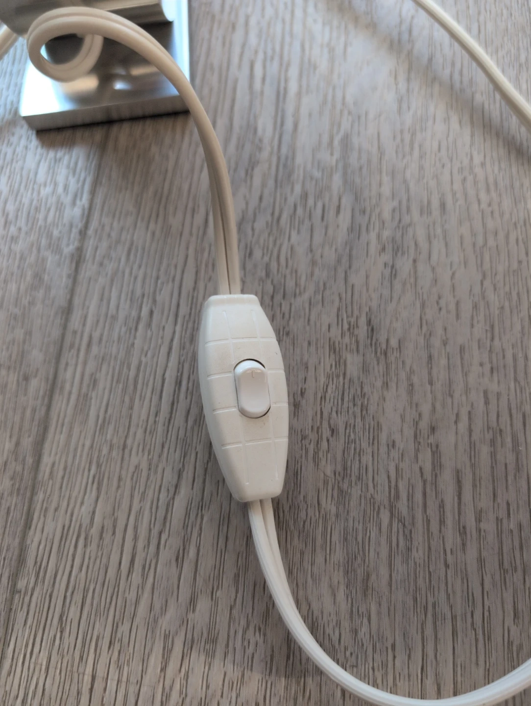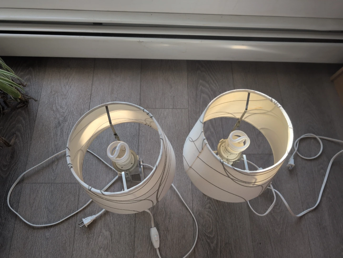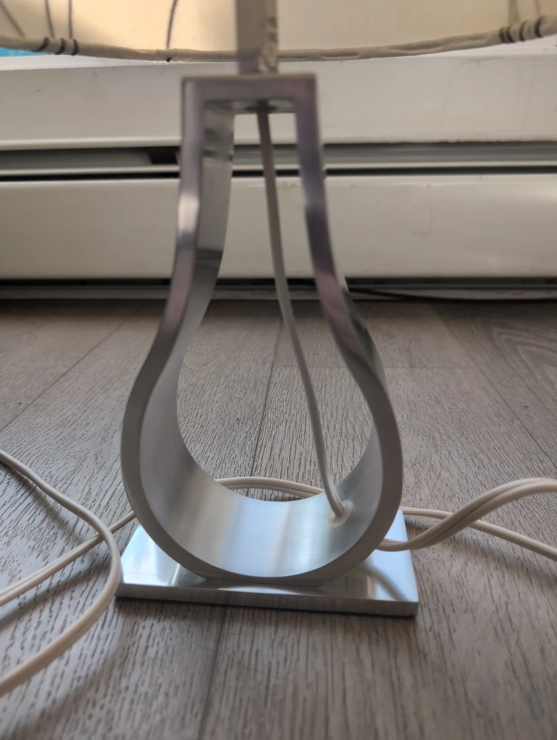 Selling a pair of matching table lamps. Each lamp has a white fabric shade with a black swirly line design. The base is made of silver-toned metal with a sleek, curved design. Perfect for a bedside table or living room. Includes the lightbulbs shown. Both work great