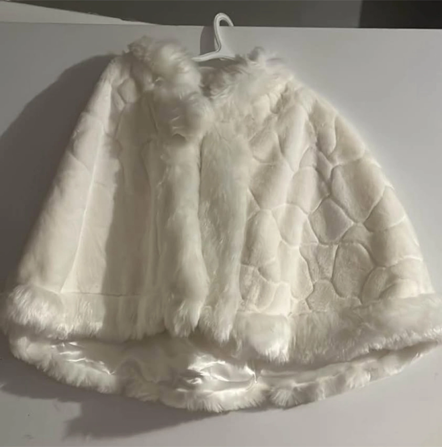 Selling a beautiful white faux fur cape! It's in great condition and perfect for adding a touch of elegance to any outfit. The faux fur is soft and cozy, making it ideal for cooler weather
