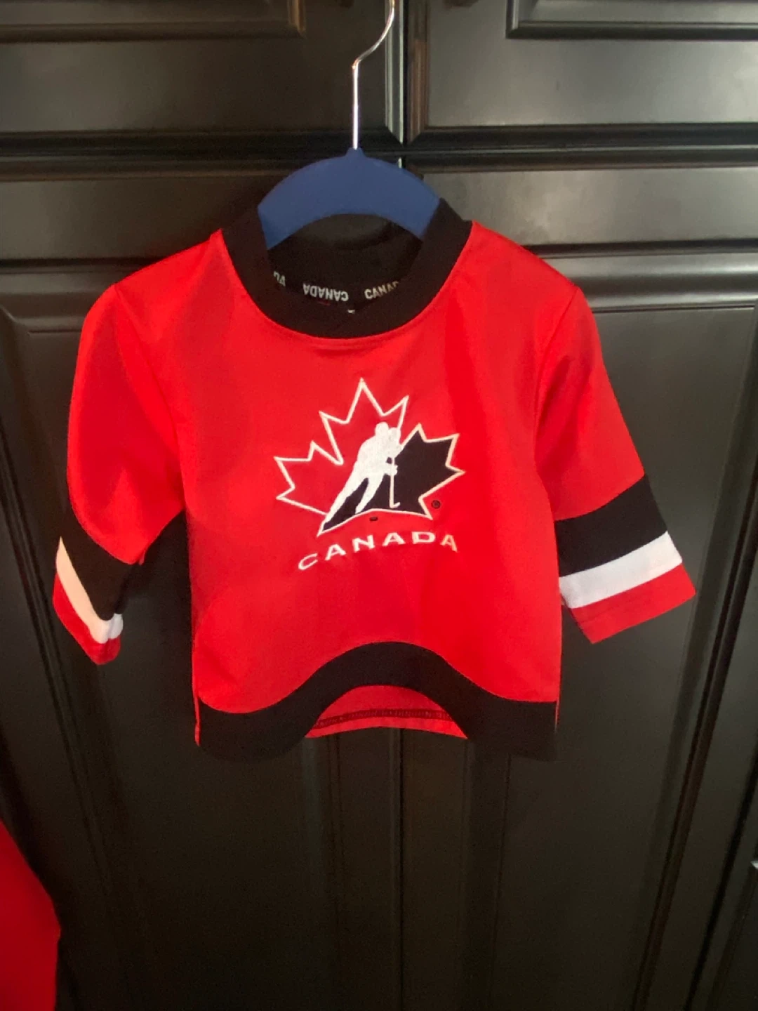 This is a kids' hockey jersey. It's red with black and white accents and features a Canada maple leaf logo with a hockey player. Made from 100% polyester. Size 12 months.