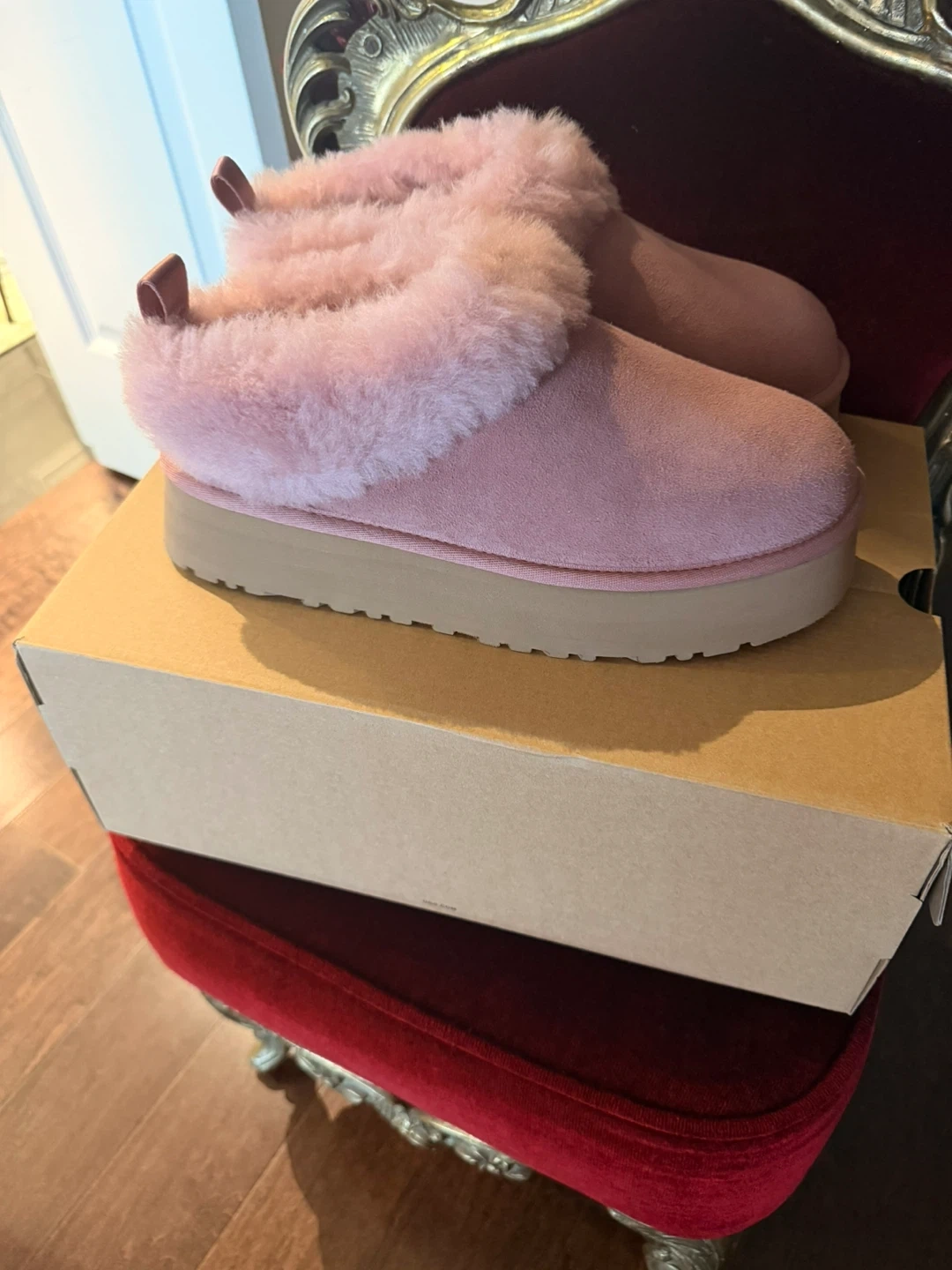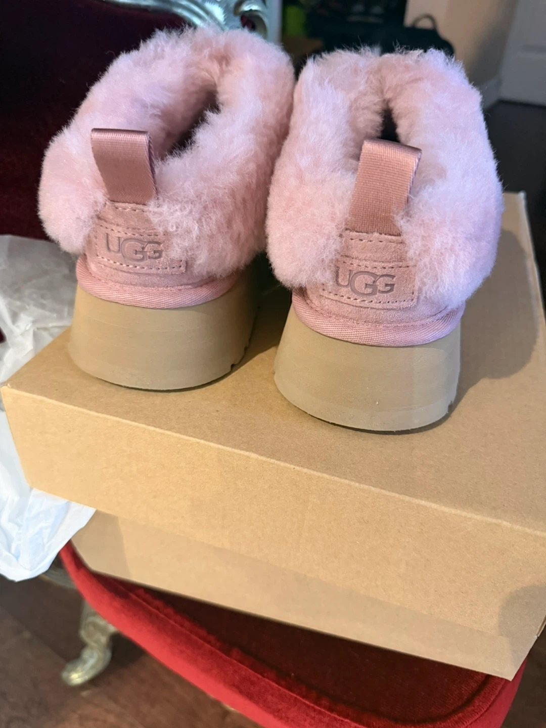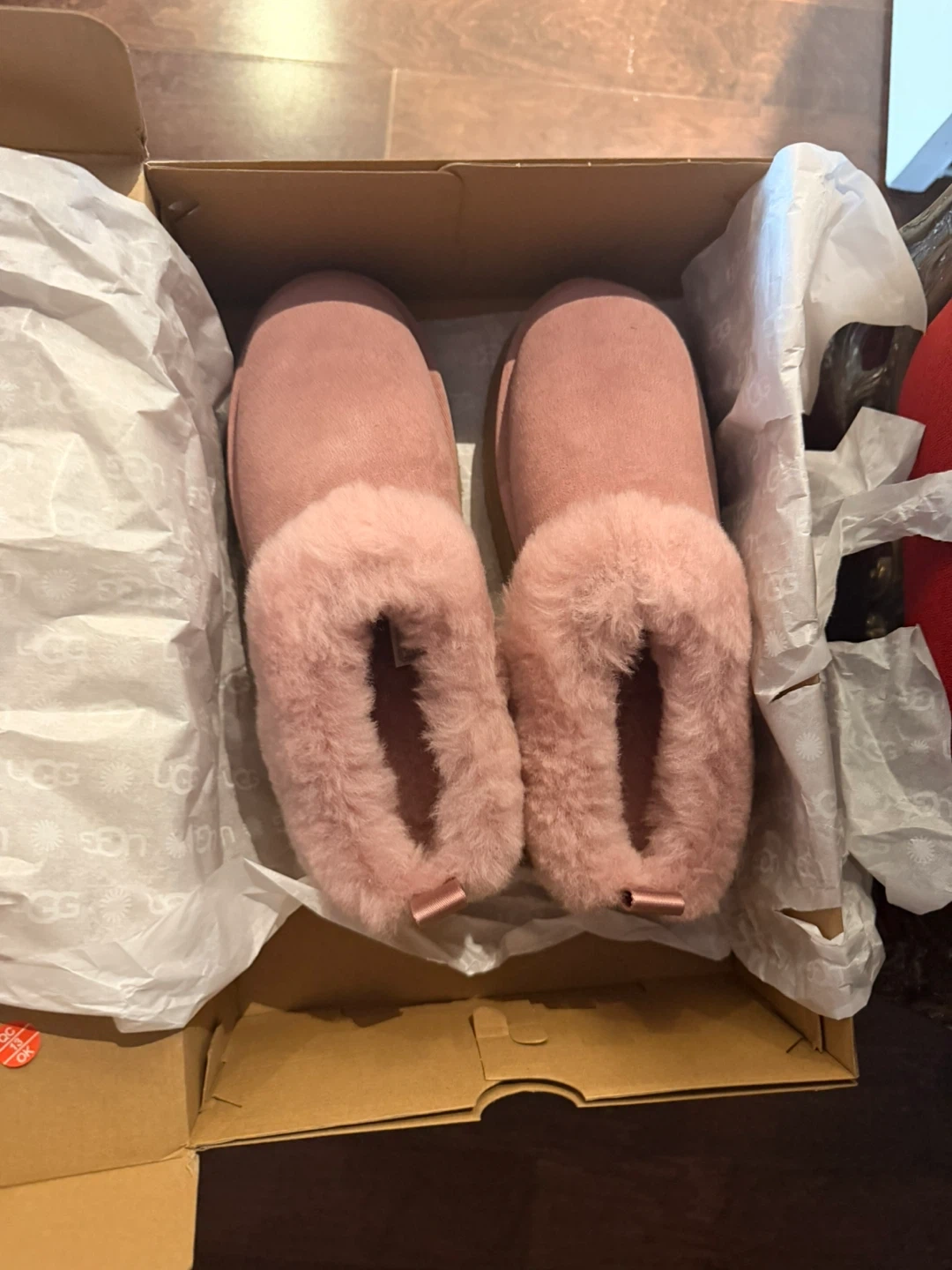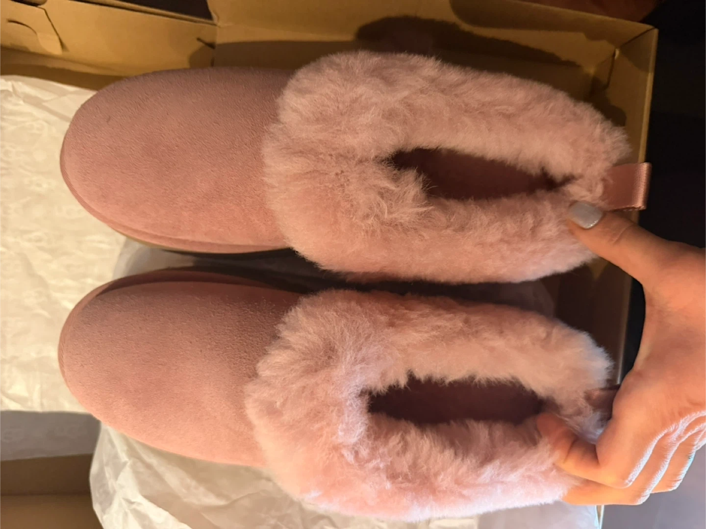 Brand New - UGG pink suede slippers with fluffy lining. Includes original box. These cozy slippers are perfect for lounging around the house.