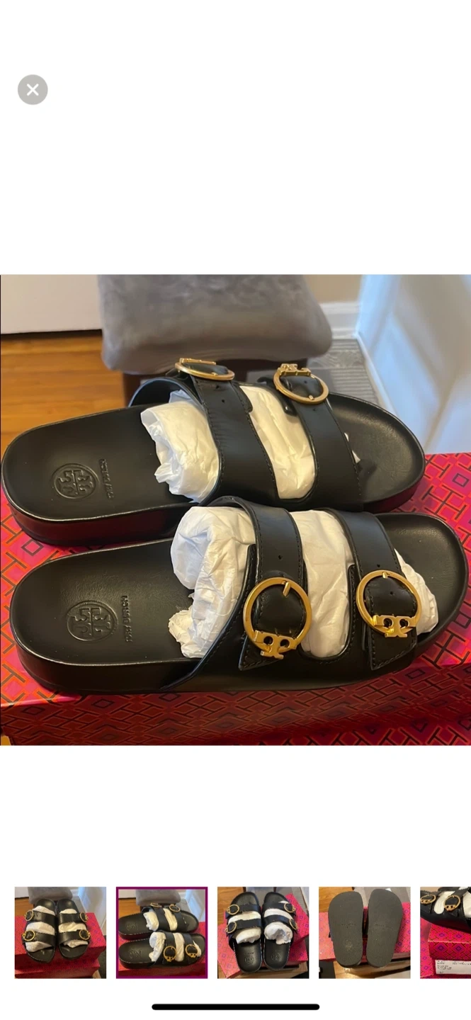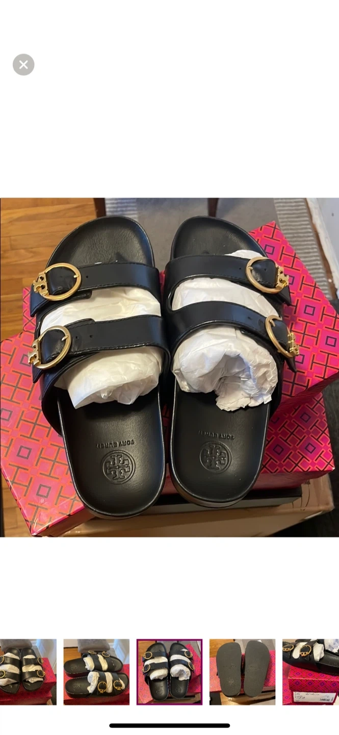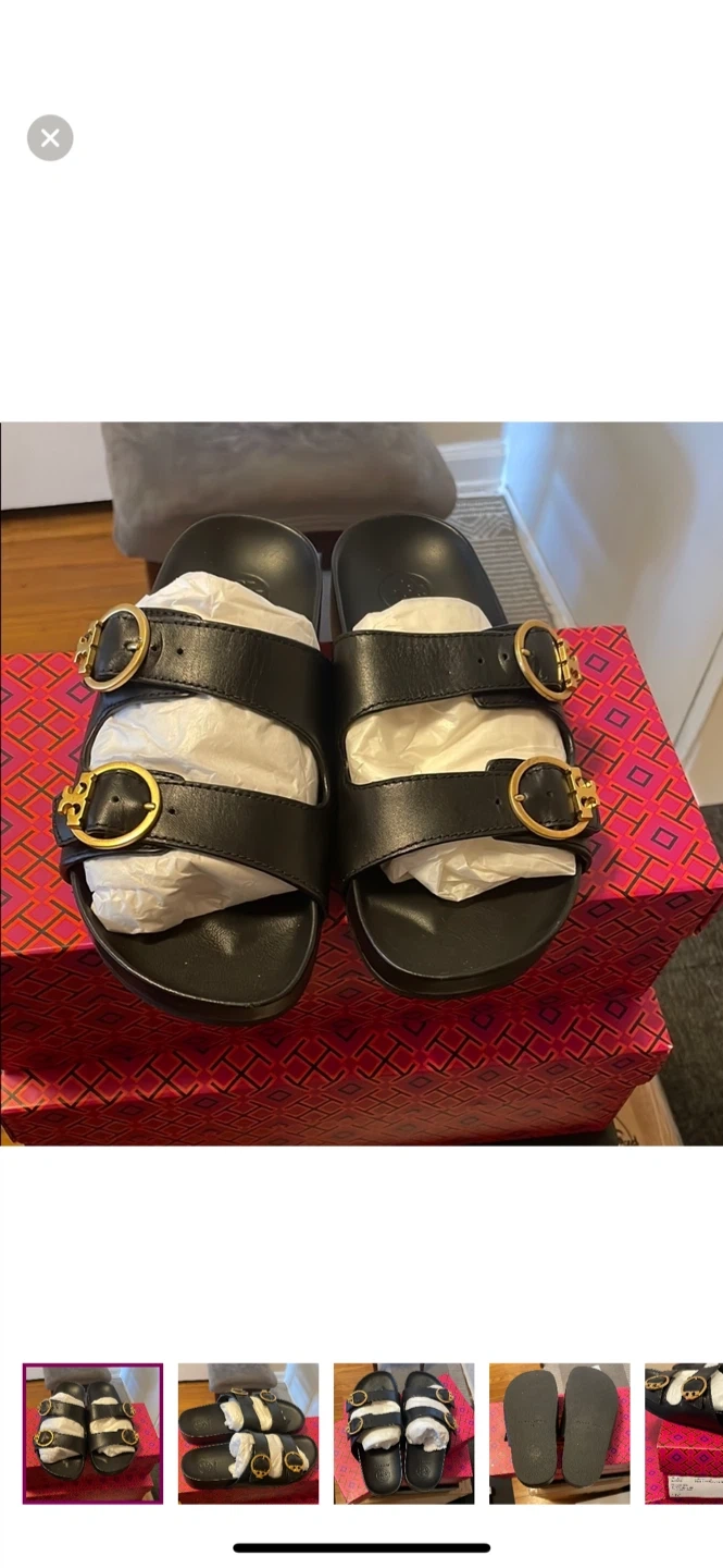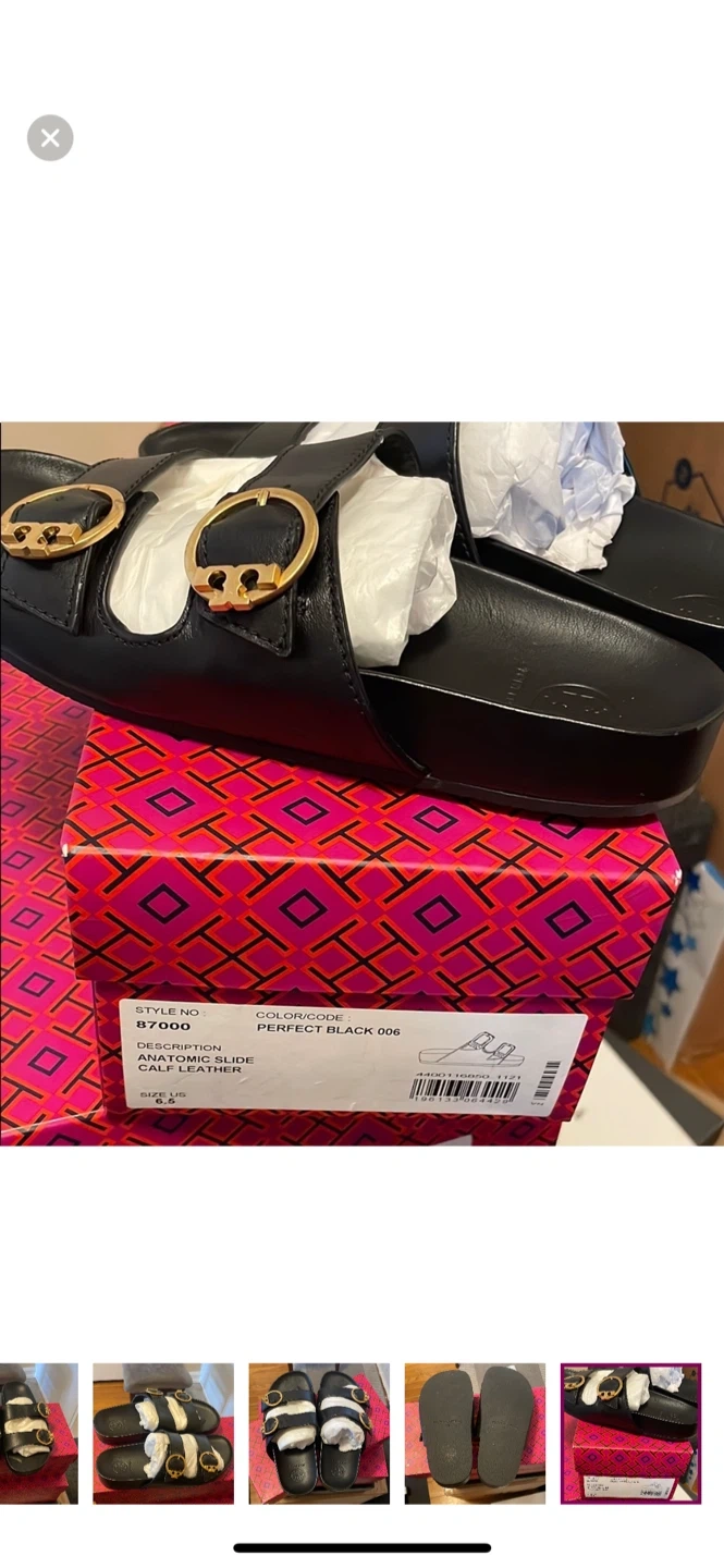 These are a pair of brand new Tory Burch sandals in US size 6.5. They are black leather anatomic slides and come with the original box. Perfect for a stylish and comfortable look!
