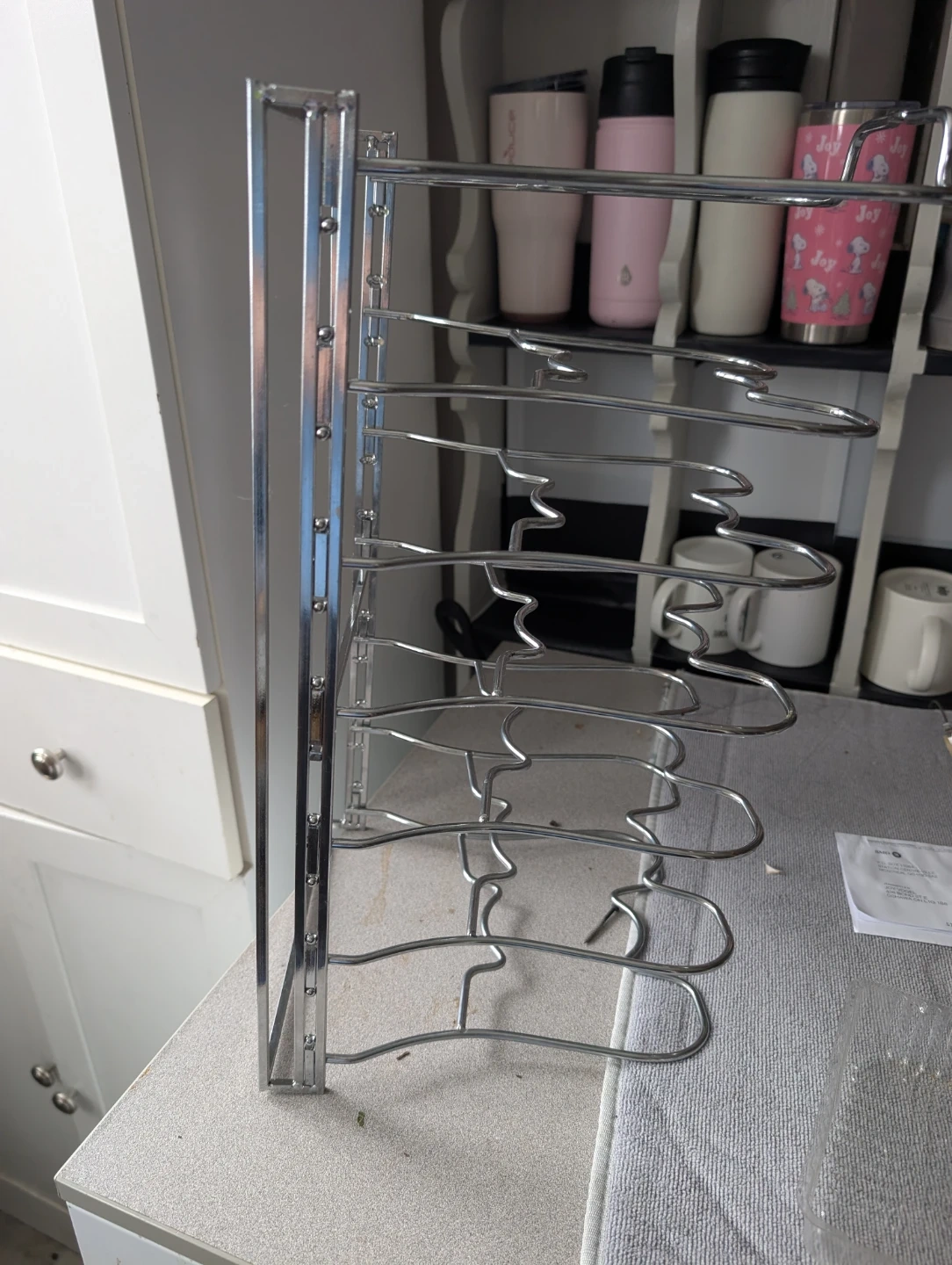 This organizer rack is made of durable silver metal. It features multiple slots designed to hold pot lids upright and easily accessible. Perfect for keeping your kitchen cabinets tidy and maximizing storage space! No delivery.