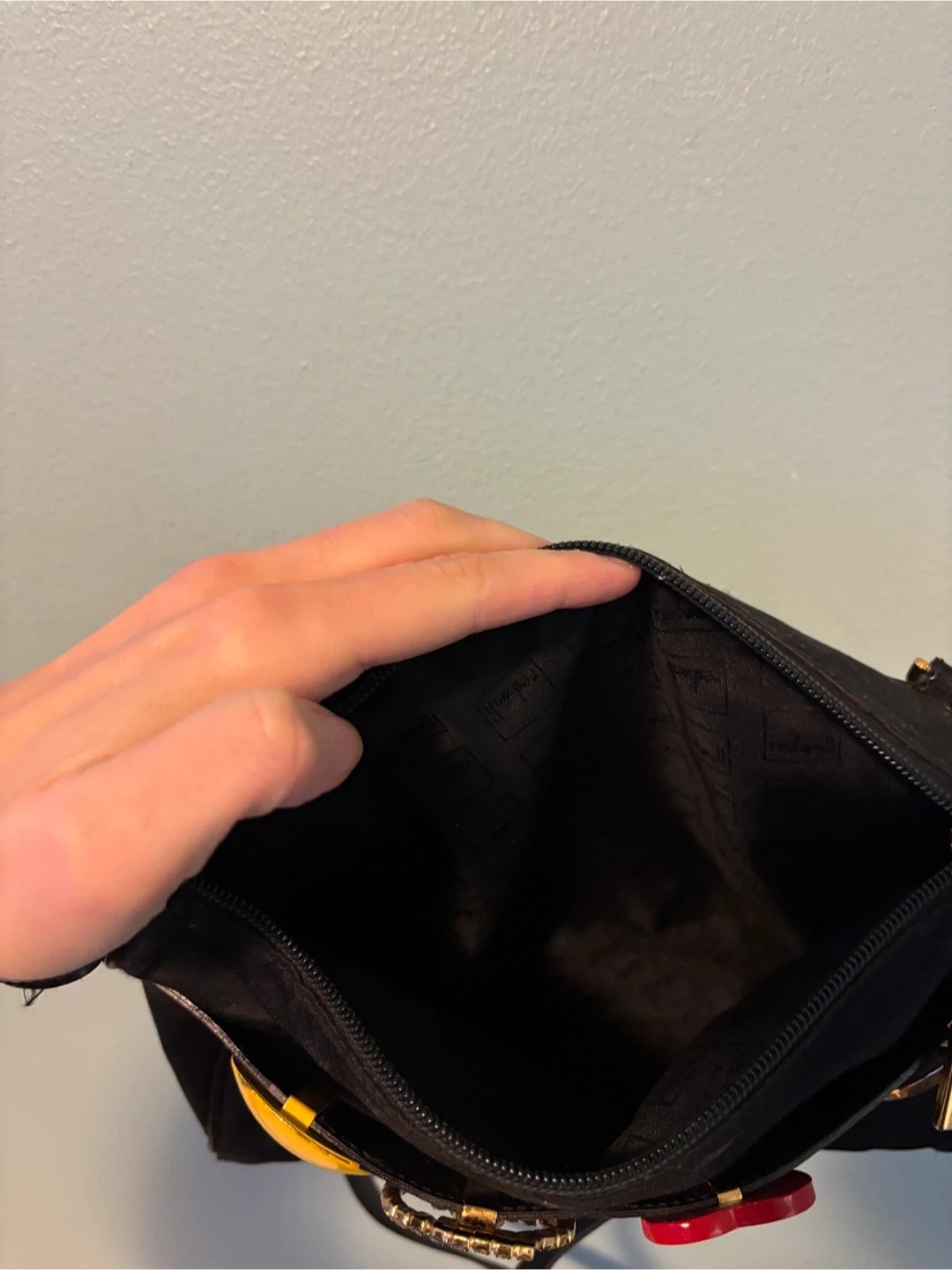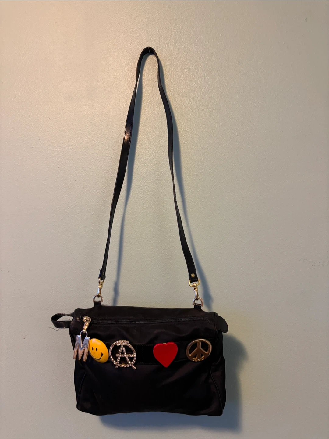 A black Moschino crossbody bag made in Italy. It features multiple playful charms, including a smiley face, peace sign, heart, and the letter M. The interior lining is patterned.