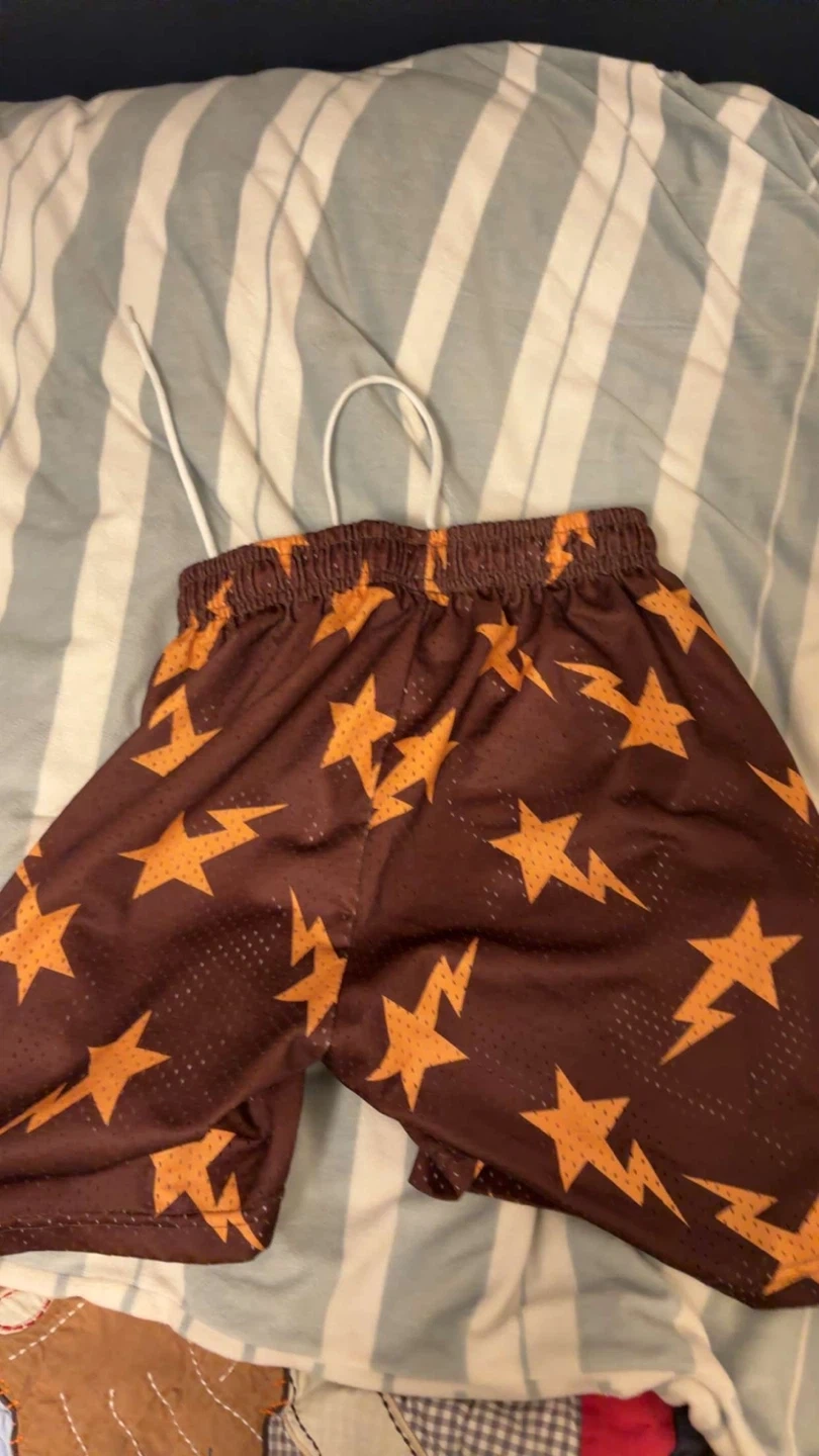 BAPE brown shorts with all-over star pattern, clean condition and comfortable fit. High-quality material with a standout design, perfect for streetwear outfits.