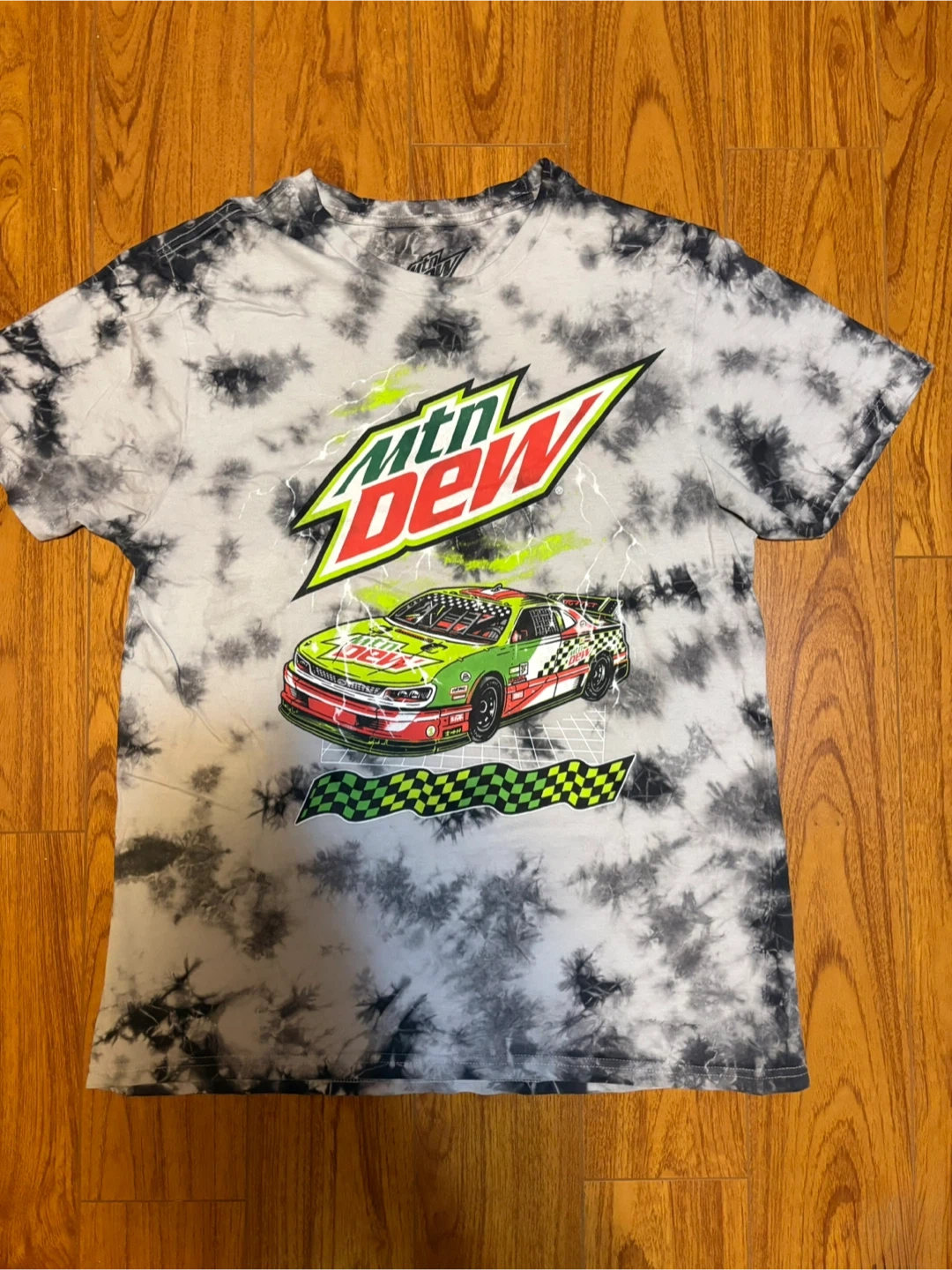 This Mtn Dew graphic tee features a cool tie-dye pattern. It's a size large with a vibrant racing car print. 100% cotton for comfort!