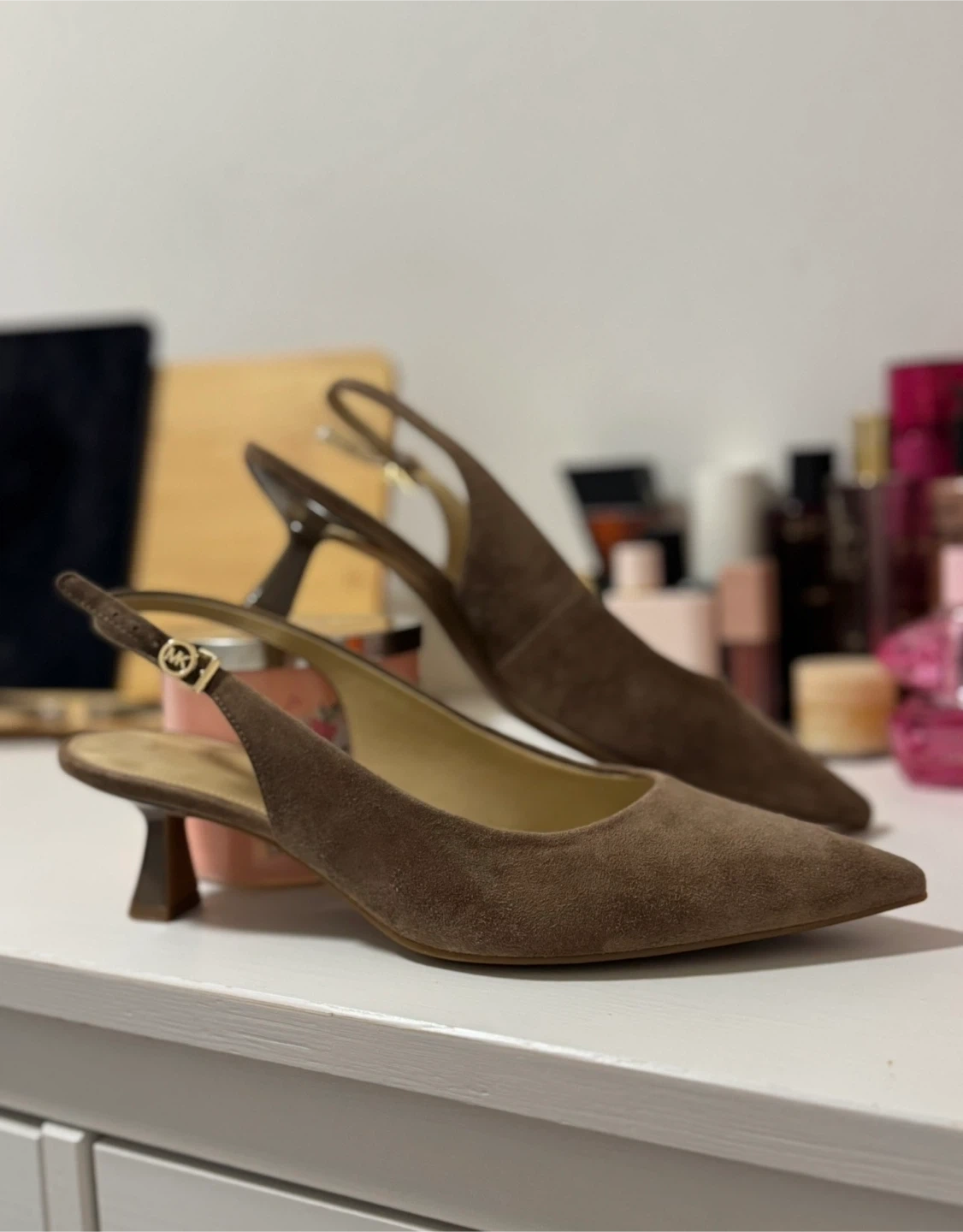 Chic Michael Kors slingback heels made from soft brown suede. They feature a pointed toe and a stylish flared heel with a buckle accent. These shoes are a versatile addition for any wardrobe!